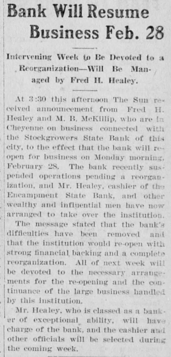 Bank Will Resume Business Feb. 28 Intervening Week to Be Devoted to a Reorganization-Will Be Managed by Fred H. Healey. At 3:30 this afternoon The Sun received announcement from Fred H. Healey and M. B. McKillip, who are in Cheyenne on business connected with the Stockgrowers State Bank of this city, to the effect that the bank will reopen for business on Monday morning, February 28. The bank recently suspended operations pending a reorganization, and Mr. Healey, cashier of the Encampment State Bank, and other wealthy and influential men have now arranged to take over the institution. The message stated that the bank's difficulties have been removed and that the institution would re-open with strong financial backing and a complete reorganization. All of next week will be devoted to the necessary arrangements for the re-opening and the continuance of the large business handled by this institution. Mr. Healey, who is classed as a bank er of exceptional ability, will have charge of the bank, and the cashier and other officials will be selected during the coming week.