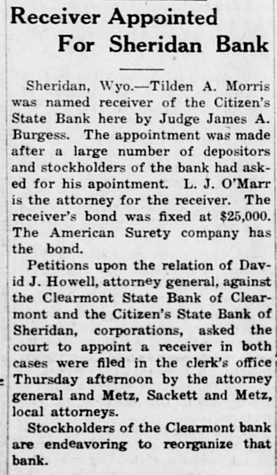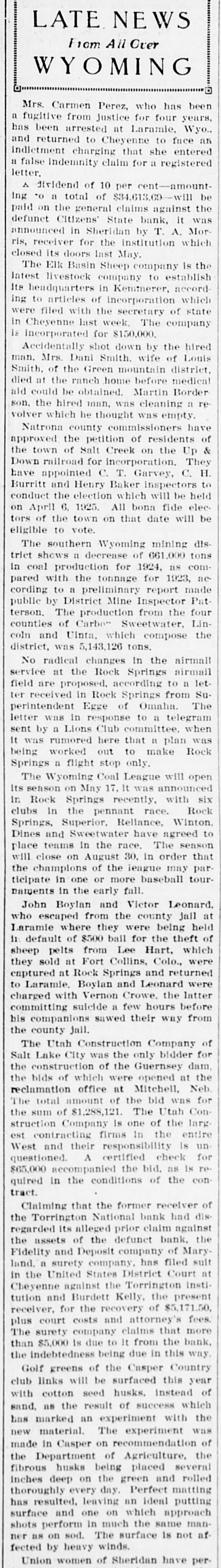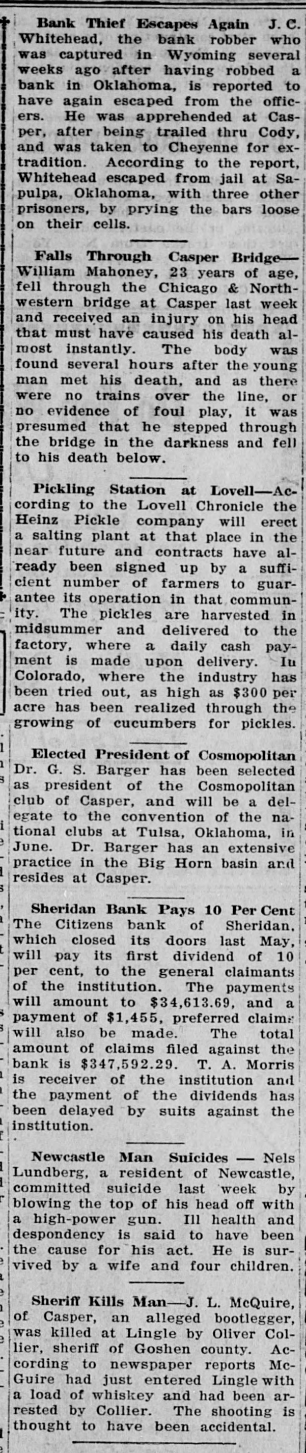 Bank Thief Escapes Again J.C. Whitehead, the bank robber who was captured in Wyoming several weeks ago after having robbed a bank in Oklahoma, is reported to have again escaped from the officers. He was apprehended at Casper, after being trailed thru Cody, and was taken to Cheyenne for extradition. According to the report, Whitehead escaped from jail at Sapulpa, Oklahoma, with three other prisoners, by prying the bars loose on their cells. Falls Through Casper BridgeWilliam Mahoney, 23 years of age, fell through the Chicago & Northwestern bridge at Casper last week and received an injury on his head that must have caused his death almost instantly. The body was found several hours after the young man met his death, and as there were no trains over the line, or no evidence of foul play, it was presumed that he stepped through the bridge in the darkness and fell to his death below. Pickling Station at Lovell-According to the Lovell Chronicle the Heinz Pickle company will erect a salting plant at that place in the near future and contracts have already been signed up by a sufficient number of farmers to guarantee its operation in that community. The pickles are harvested in midsummer and delivered to the factory, where a daily cash payment is made upon delivery. In Colorado, where the industry has been tried out, as high as $300 per acre has been realized through the growing of cucumbers for pickles. Elected President of Cosmopolitan Dr. G. S. Barger has been selected as president of the Cosmopolitan club of Casper, and will be a delegate to the convention of the national clubs at Tulsa, Oklahoma, in June. Dr. Barger has an extensive practice in the Big Horn basin and resides at Casper. Sheridan Bank Pays 10 Per Cent The Citizens bank of Sheridan. which closed its doors last May, will pay its first dividend of 10 per cent, to the general claimants of the institution. The payments will amount to $34,613.69, and a payment of $1,455, preferred claims will also be made. The total amount of claims filed against the bank is $347,592.29. T. A. Morris is receiver of the institution and the payment of the dividends has been delayed by suits against the institution. Newcastle Man Suicides - Nels Lundberg, a resident of Newcastle, committed suicide last week by blowing the top of his head off with a high-power gun. Ill health and despondency is said to have been the cause for his act. He is survived by a wife and four children. Sheriff Kills Man-J. L. McQuire, of Casper, an alleged bootlegger, was killed at Lingle by Oliver Collier, sheriff of Goshen county. According to newspaper reports McGuire had just entered Lingle with a load of whiskey and had been arrested by Collier. The shooting is thought to have been accidental.