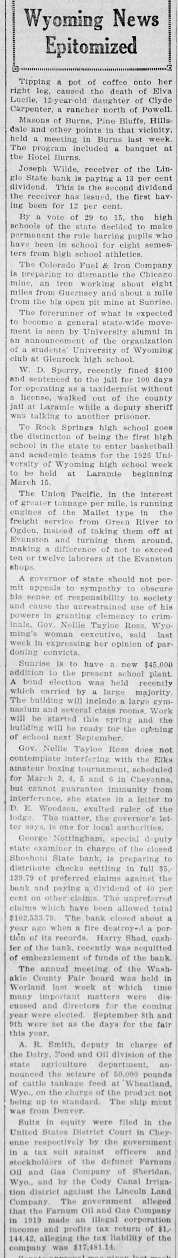Wyoming News Epitomized Tipping a pot of coffee onto her right leg, caused the death of Elva Lucile, 12-year-old daughter of Clyde Carpenter, a rancher north of Powell. Masons of Burns, Pine Bluffs, Hillsdale and other points in that vicinity, held a meeting in Burns last week. The program included a banquet at the Hotel Burns. Joseph Wilde, receiver of the Lingle State bank is paying a 13 per cent dividend. This is the second dividend the receiver has issued, the first having been for 12 per cent. By a vote of 29 to 15, the high schools of the state decided to make permanent the rule barring pupils who have been in school for eight semesters from high school athletics. The Colorado Fuel & Iron Company is preparing to dismantle the Chicago mine, an iron working about eight miles from Guernsey and about a mile from the big open pit mine at Sunrise. The forerunner of what is expected to become a general state-wide movement is seen by University alumni in an announcement of the organization of a students' University of Wyoming club at Glenrock high school. W. D. Sperry, recently fined $100 and sentenced to the jail for 100 days for operating as a taxidermist without a license, walked out of the county jail at Laramie while a deputy sheriff was talking to another prisoner. To Rock Springs high school goes the distinction of being the first high school in the state to enter basketball and academic teams for the 1926 University of Wyoming high school week to be held at Laramie beginning March 15. The Union Pacific, in the interest of greater tonnage per mile, is running engines of the Mallet type in the freight service from Green River to Ogden, instead of taking them off at Evanston and turning them around, making a difference of not to exceed ten or twelve laborers at the Evanston shops. A governor of state should not permit appeals to sympathy to obscure his sense of responsibility to society and cause the unrestrained use of his powers in granting clemency to criminals, Gov. Nellie Tayloe Ross, Wyoming's woman eexcutive, said last week in expressing her opinion of pardoning convicts. Sunrise is to have a new $45,000 addition to the present school plant. A bond election was held recently which carried by a large majority. The building will include a large gymnasium and several class rooms. Work will be started this spring and the building will be ready for the opening of school next September. Gov. Nellie Tayloe Ross does not contemplate interfering with the Elks amateur boxing tournament, scheduled for March 3, 4, 5 and 6 in Cheyenne, but cannot guarantee immunity from interference, she states in a letter to D. E. Woodson, exalted ruler of the lodge. The matter, the governor's letter says, is one for local authorities. George Nottingham, special deputy state examiner in charge of the closed Shoshoni State bank, is preparing to distribute checks settling in full $5,139.79 of preferred claims against the bank and paying a dividend of 40 per cent on other claims. The unpreferred claims which have been allowed total $102,533.79. The bank closed about a year ago when a fire destroyed a portion of its records. Harry Shad, cashier of the bank, recently was acquitted of embezzlement of funds of the bank. The annual meeting of the Washakie County Fair board was held in Worland last week at which time many important matters were discussed and directors for the coming year were elected. September 8th and 9th were set as the days for the fair this year.