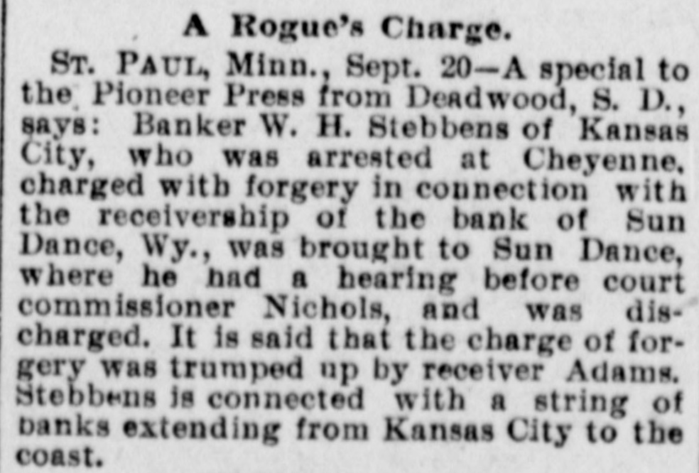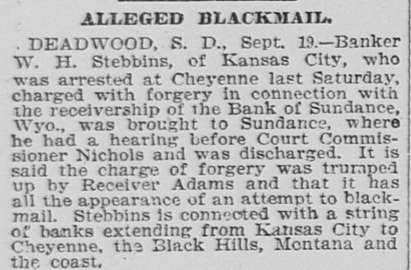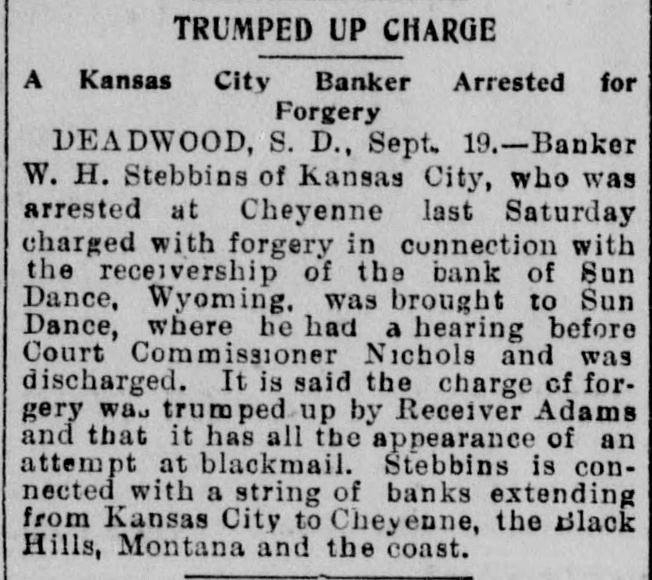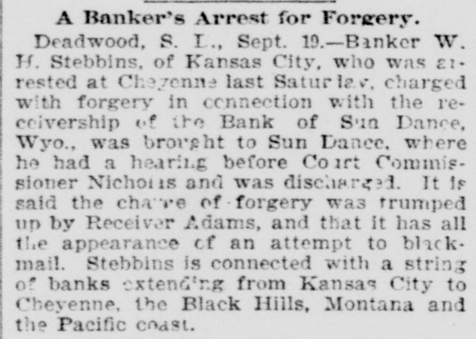 A Banker's Arrest for Forgery. Deadwood, S. I., Sept. 19.-Banker W. H. Stebbins, of Kansas City, who was 21. rested at Chezenne last Saturlav, charged with forgery in connection with the receivership of the Bank of Sun Dance, Wyo., was brought to Sun Dance. where he had a hearing before Court Commissioner Nicholis and was discharged. It is said the charre of forgery was trumped up by Receiver Adams, and that it has all the appearance of an attempt to black. mail. Stebbins is connected with a string of banks extending from Kansas City to Cheyenne, the Black Hills, Montana and the Pacific coast.