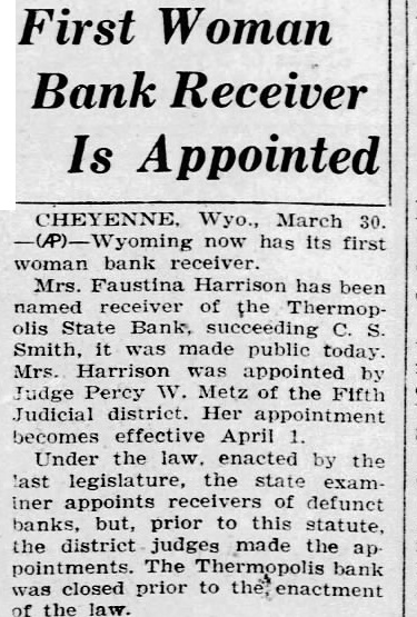 First Woman Bank Receiver Is Appointed CHEYENNE, Wyo., March 30. now has its first woman bank receiver. Mrs. Faustina Harrison has been named receiver of the Thermopolis State Bank, succeeding S. Smith, was made public today. Mrs. Harrison was appointed by Judge Percy W. Metz of the Fifth Judicial district. Her appointment becomes effective April Under the law. enacted by the last legislature, the state examIner appoints receivers of defunct banks, but, prior to this statute, the district judges made the ap pointments. The Thermopolis bank closed prior to enactment of the law.