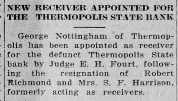 NEW RECEIVER APPOINTED FOR THE THERMOPOLIS STATE BANK George Nottingham of Thermopolis has been appointed as receiver for the defunct Thermopolis State bank by Judge E. H. Fourt, following the resignation of Robert Richmond and Mrs. S. F. Harrison, formerly acting as receivers.