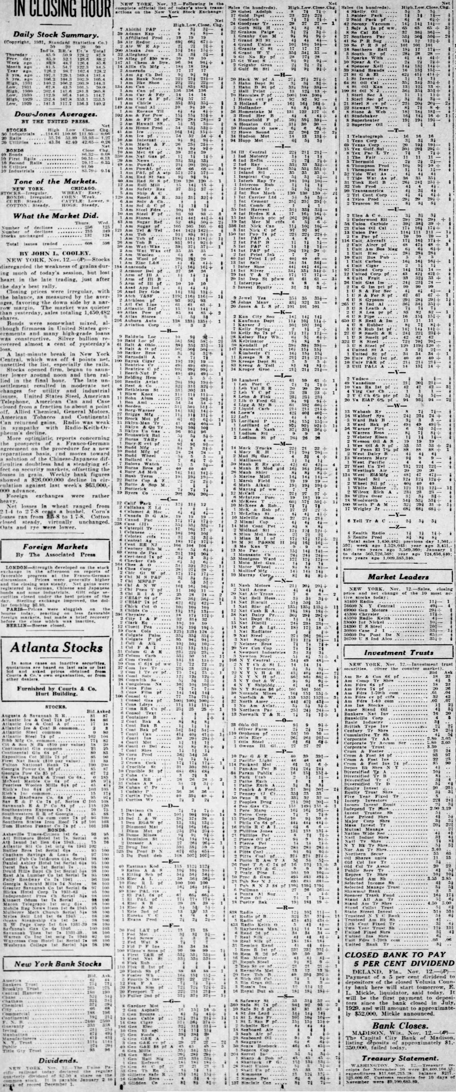 Atlanta Stocks In some cases on inactive securities. prices from other Furnished by Courts & Co. Hurt Building. New York Bank Stocks Market Leaders Investment Trusts Augusta Atlantic Spg BONDS. Consti Folly Georgia Corp Kinnett Serial Macon College 1st Serial NEW YORK. Following IN CLOSING HOUR hundreds) the Stock Net P&P Daily Stock Summary. Affiliated Standard Thursday Dow-Jones Averages. Studebaker Superheater BY THE UNITED PRESS. Superior STOCKS High Chg. Utilities BONDS Rails Thermoid Industrials Tone of the Markets. NEW YORK CHICAGO. CATTLE Steady What the Market Did. Number declines Stocks 137 traded 608 BY JOHN L. COOLEY. NEW YORK, Nov. 12. disregarded the of grains during much of today's session, but lost heart in the late trading, just after the day's best rally Closing prices were irregular, with the balance. as measured by the averages, favoring the down side by nar. row margin. The was quieter than yesterday, sales totaling 1,450,482 shares. Bonds were somewhat mixed, although firmness in United States gov. ernments and many high grade loans was constructive. Silver bullion recovered almost a cent of yesterday's last minute break in New York Central. which was off points net, unsettled the list the rails. Stocks opened firm. began to saunter lower around noon and then rallied in the final hour. The late settlement resulted in changes for utility and industrial issues. United States Steel, American Telephone, American Can and Case closed from fraction to about point off. Allied Chemical, General Motors. American Tobacco and Continental Can returned gains. Radio weak in sympathy with Radio Keith Orpheum's decline. More optimistic reports concerning the prospects of German on the for new reparations basis moves toward Dairy solution of the Chinese Japanese dif feet on markets. offsetting the Westingh losses in Weekly bank figures showed decline in circulation against last week's $63,000,White 000 Foreign exchanges were rather heavy. Net losses in wheat ranged from Wrigley 1-4 to Corn's losses ran from 8 17-8 Cotton closed virtually unchanged. Yell Oats and rye were lower. Zenith Radio Prod day Foreign Markets week year January By The Associated Press two LONDON. developed on the reports the were generally higher and the Net Motors in and Japanese NEW YORK Nov and of closed under the best the dol- 83400 Central were sluggish the Motors brief inactive. NEW Fdrs Northern Stand Bankers Industry British Cumulative Foster Investors Invest CLOSED BANK TO PAY 5 PER CENT DIVIDEND DELAND. Fla., Nov. Payment per dividend to depositors of the closed Volusia County bank here will start tomorrow, E. Hanover Mickle. liquidator, said today. It will be the first payment to deposisince the bank closed in July. Gardner 1929. and will ly $52,000, Mickle announced. Bank Closes. MADISON, Wis Nov. The Capital City Bank of Madison, Trust listing deposits approx $1. failed today Treasury Statement. Dividends. for 10 days Glidden November were