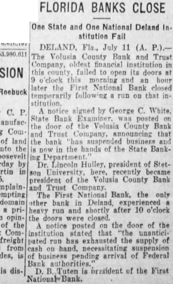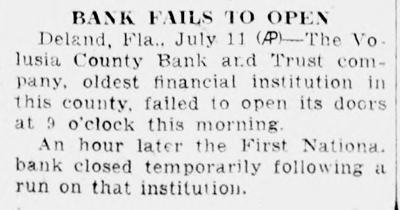Press) De Land, Fla., July 12.-The Volusia County Bank and Trust Company, oldest financial institution in this county, failed to open its doors at 9:00 o'clock Thursday morning and an hour later the First National Bank closed temporarily, following a run on that institution. A notice, signed by George C. White, state bank examiner, was posted on the door of the Volusia County Bank and Trust Company, announcing that the bank "has suspended business and is now in the hands of the state banking department."