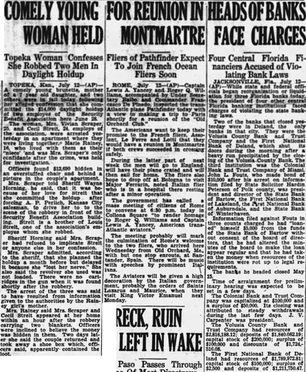 Topeka Woman Confesses She Robbed Two Men In Daylight Holdup year and she mitted the holdup Benefit June The Mrs. Vivian and Cecil in an they Marie Rainey, who with them as "nlece" and was Scraper's confidante after the crime, was held for investigation. Officers found $13,690 hidden in an chair behind in the Mrs. said, that her Streit that the holdup after A. salesman, drive her to scene the in front of Security build- Louis Streit brother of Streit, one the employes she robbed. Sheriff Horning said Mrs. Scraphad refused implicate Streit in her confession. Scraper according sheriff, planned the holdup but delayed It because she "lost nerve.' She also said revolver used was There cartridges gun when was found shortly after robbery. arrest the three was said to have resulted given to the authorities by the Rainmother. Rainey Mrs. Scraper and Cecil her home within an hour after the robbery carrying blankets. Officers were inclined to believe the money was hidden in them. Two days later she the returned and took away shoe which, officers said, apparently contained the