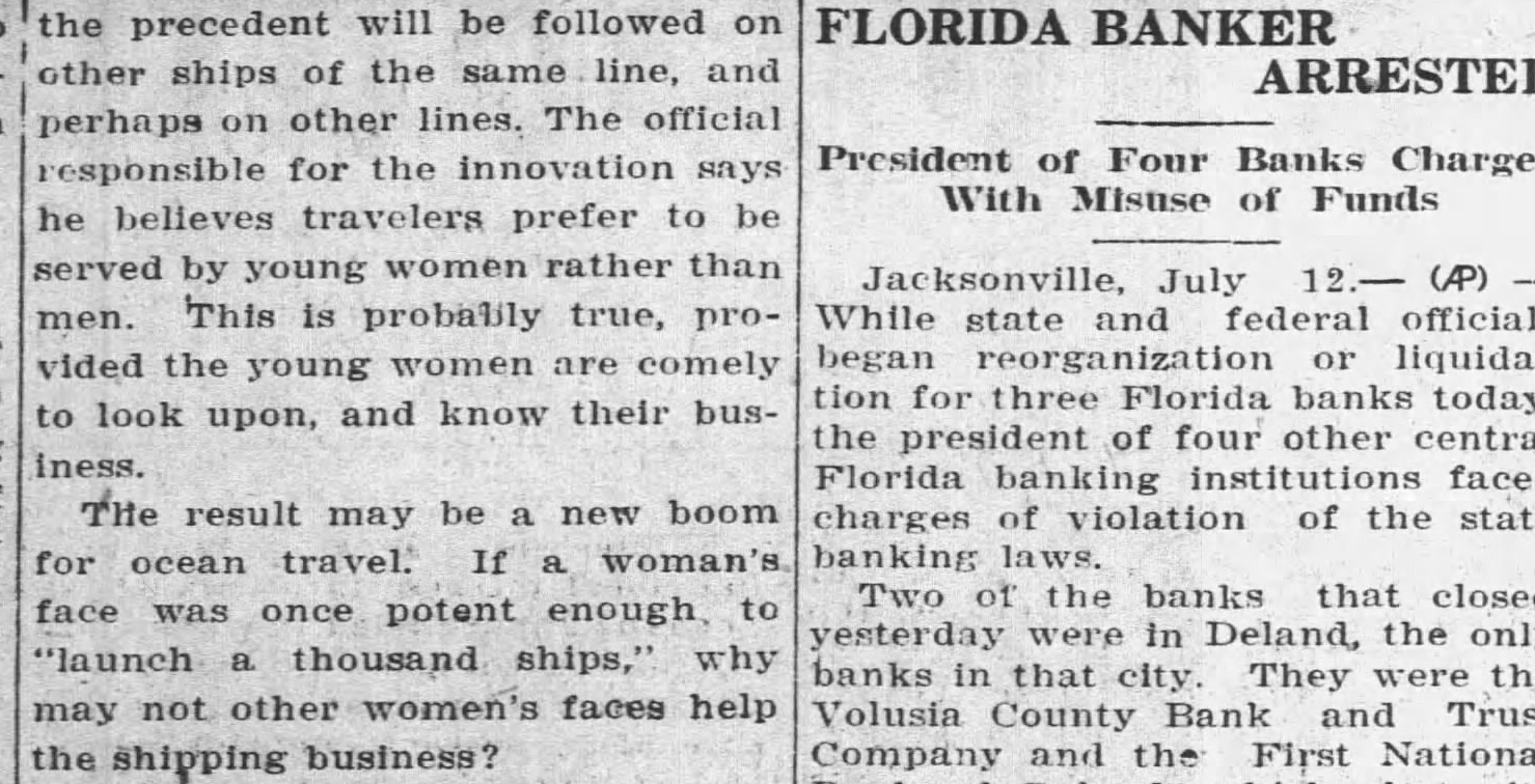 the precedent will be followed on FLORIDA BANKER other ships of the same line, and ARRESTED perhaps other lines. The official President of Four Banks Charged responsible for the innovation With Misuse of Funds he believes travelers prefer to be served by young women than July (AP) men. This is probably true, pro- While state and federal officials began liquidavided the young women are comely tion three Florida today, to look upon, and know their busthe president of four other central iness. faced result may be new boom charges violation of the state ocean travel. woman's banking Two the banks that closed face was once potent enough were in Deland, only "launch thousand ships," banks that city They the may not other women's faces help Volusia County Bank and Trust shipping business? Company the First