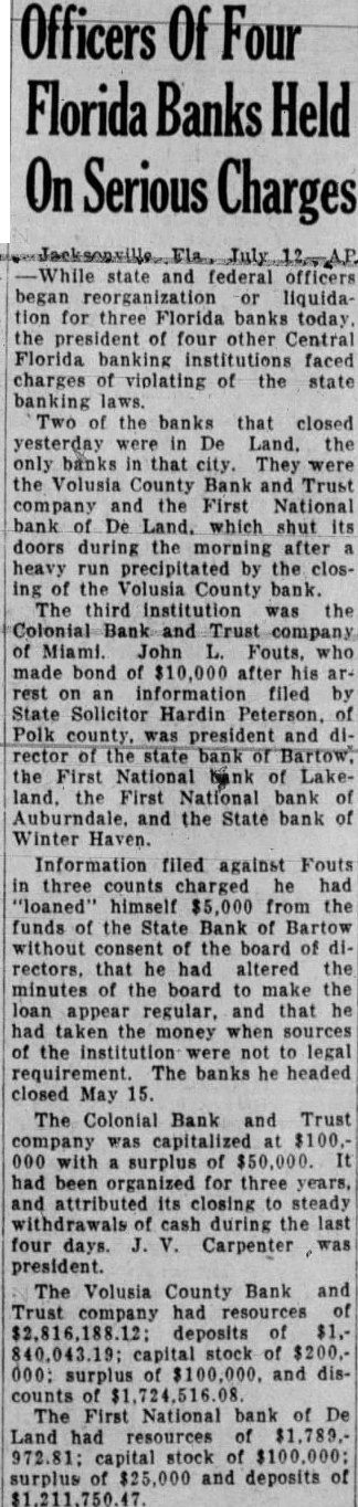 Two More Florida Banks Close Up JACKSONVILLE, Fla., July 12 (U.P)-Deland was without a financial institution today, resulting from the closing yesterday of the First National Bank and the Volusia County Bank and Trust Company. Runs during the past four days also caused the Colonial Bank and Trust Company, of Miami, capitalized at $100,000, to cease business. John L. Fouts, of Bartow, was arrested late yesterday at Winterhaven on a charge of violating the state banking laws and was freed on $10,000 bond. Fouts was president and director of four central Florida banks which closed their doors on May 15 of this year.