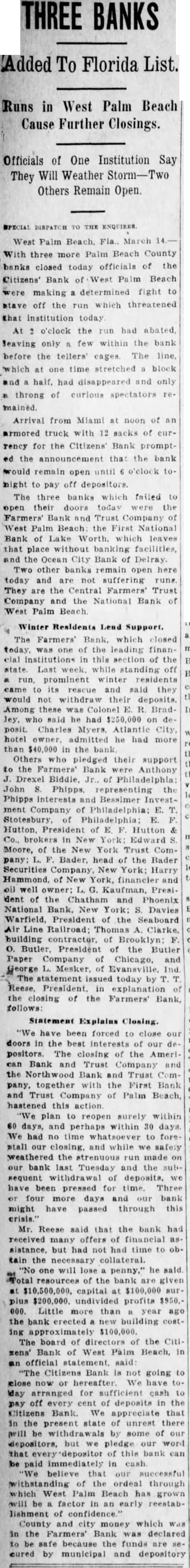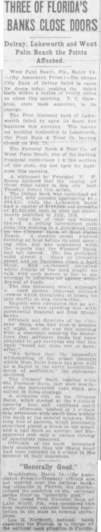 (By The Associated Press) WEST PALM BEACH (Fla.) March 14-Three Palm Beach County banks failed to open their doors to-day, while another local financial institution sought to stave off run. The Farmers' Bank and Trust West Palm Beach, one the in this section did to-day midnight by Reese, its president that the closBeach bank last Tuesday had precipitated the First Na tional Bank of Worth and the Bank of Del Ray did open this morning. No reasons their separate actions were made public Hawkins, state bank examiner, assumed of the Del institution Lake Worth left that city with bank The Del Ray bank was capitalized deposits aggregat ing and the Lake bank had capital of $100,000 and in published in July,