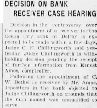 Decision in the controversy over the of receiver the Ocean City bank of Delray CXpected to few Judge Chillingworth said yesterday. Judge Chillingworth is withholding pending the receipt of further information from Ernest comptroller. Following the appointment of C. W. Bethel by Mr. depositors the bank objected to Judge Chillingworth grounds that the man named unqualified to