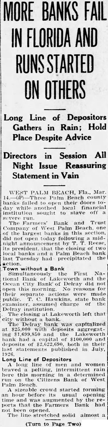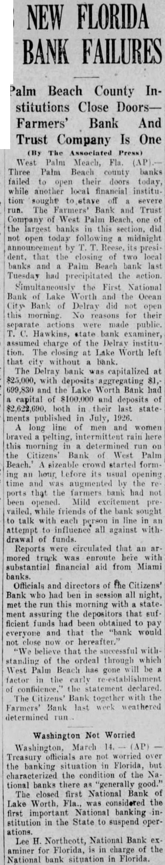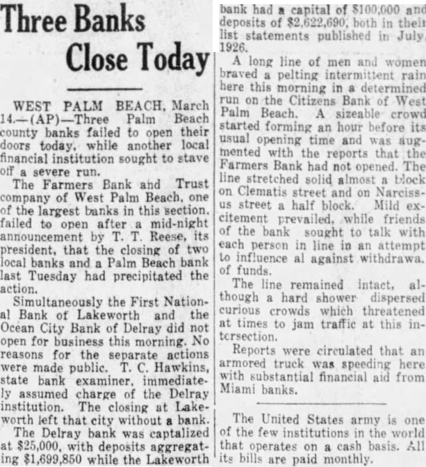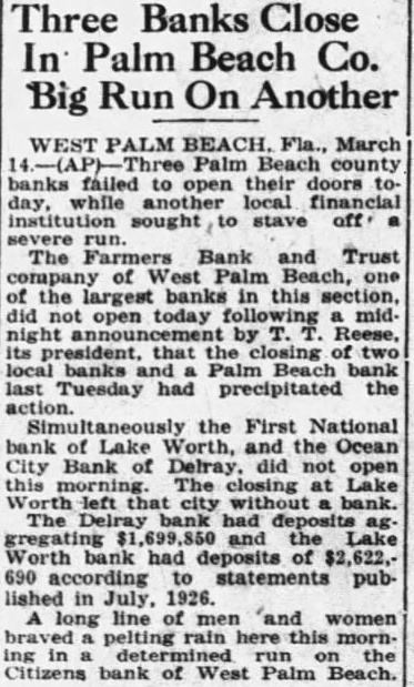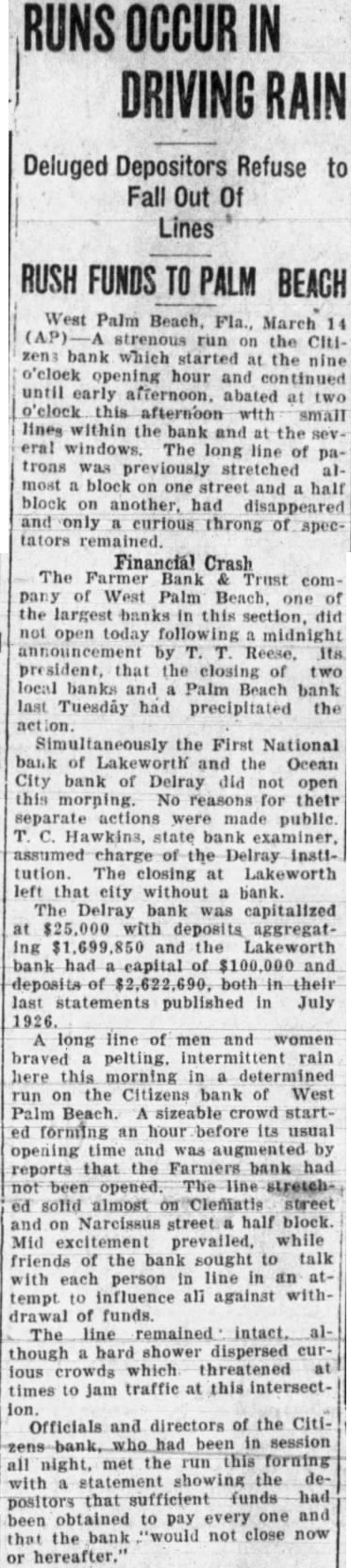 Financial Crash The Bank Trust comof West Palm Beach, of the largest banks in this section, did not open today following midnight president, that the closing two local banks and Palm Beach bank last Tuesday had precipitated the the First National bank of Lakeworth and the Ocean City bank of Delray did not open this morning. No reasons for their separate actions were made public. Hawkins, state bank examiner, assumed charge of the Delray instltution. The closing at Lakeworth left that city without bank. The Delray bank was capitalized $25,000 deposits aggregating and the Lakeworth bank had capital of and deposits of both in their last statements published in July 1926. long line of men and women braved pelting. rain here this morning determined run the Citizens bank of West Palm Beach. sizeable crowd startforming hour before its usual opening time and augmented by reports that the Farmers bank had not been opened. The stretched solid almost on Clematis street and Narcissus street half block. Mid excitement prevailed, while friends of the bank sought talk with each person in line in an tempt influence all against withof funds. The line remained intact. though hard shower dispersed lous crowds which threatened times to jam traffic at this intersection. Officials and directors of the Citihad been session the run this forning all night, met with statement showing the depositors that sufficient funds been obtained to pay every one and that the bank not close now or hereafter.'