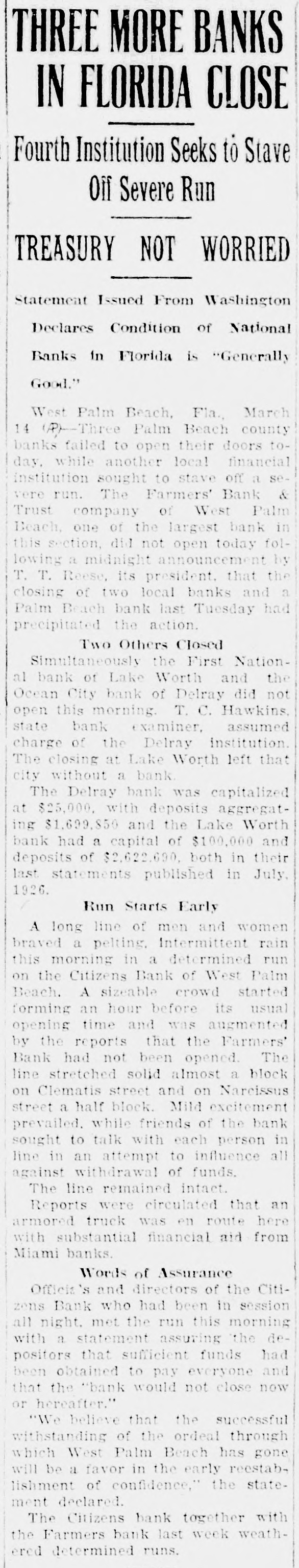THREE MURE BANKS IN FLORIDA CLOSE Fourth Institution Seeks to Stave Off Severe Run TREASURY NOT WORRIED Statement Issued From Washington Declares Condition of National Banks in Florida is "Generally Good." West Palm Beach, Fla. March 14 (P)-Three Palm Beach county banks failed to open their doors today, while another local financial institution sought to stave off a se& were run. The Farmers' Bank Trust company of West Palm Beach. one of the largest bank in this section did not open today following a midnight announcement by T. T. Reese, its president. that the closing of two local banks and a Palm Beach bank last Tuesday had precipitated the action. Two Others Closed Simultaneously the First National bank of Lake Worth and the Ocean City bank of Delray did not open this morning. T. C. Hawkins state bank examiner, assumed charge of the Delray institution. The closing at Lake Worth left that city without a bank The Delray bank was capitalized at $25,000. with deposits aggregating $1,699,850 and the Lake Worth bank had a capital of $100,000 and deposits of $2,622,690. both in their last statements published in July, 1926. Run Starts Early A long line of men and women braved a pelting. Intermittent rain this morning in a determined run on the Citizens Bank of West Palm Beach. A sizeable crowd started forming an hour before its usual opening time and was augmented by the reports that the Farmers' Bank had not been opened The line stretched solid almost a block on Clematis street and on Narcissus street a half block Mild excitement prevailed. while friends of the bank sought to talk with each person in line in an attempt to influence all against withdrawal of funds. The line remained intact. Reports were circulated that an armored truck was en route here with substantial financial aid from Miami banks. Words of Assurance Officia's and directors of the Citizens Bank who had been in session all night. met the run this morning with a statement assuring the depositors that sufficient funds had been obtained to pay everyone and that the "bank would not close now or thereafter." "We believe that the successful withstanding of the ordeal through which West Palm Beach has gone will be a favor in the early reestablishment of confidence," the statement declared. The Citizens bank together with the Farmers bank last week weathered determined runs.