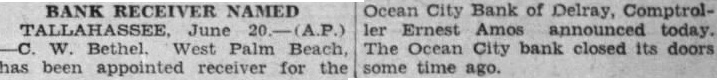 Ocean City Bank of Delray, Comptroller Ernest Amos announced today. The Ocean City bank closed its doors some time ago.