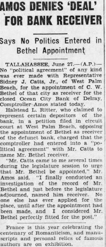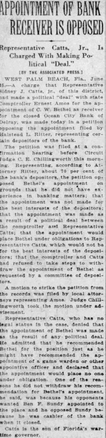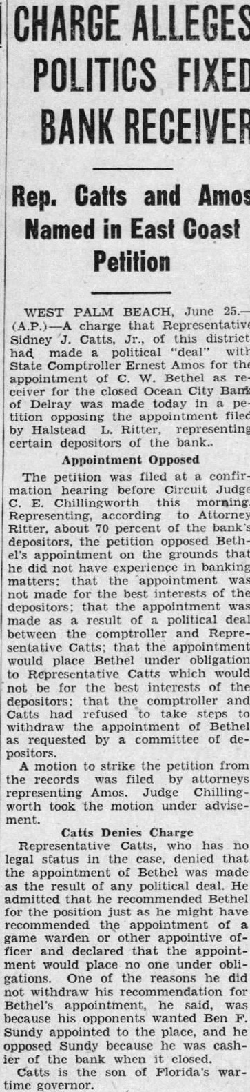 [BY THE ASSOCIATED PRESS.] WEST PALM BEACH. Fla., June charge that Sidney Catts, jr., of this district, had political "deal" with state Comptroller Ernest Amos for the appointment Bethel receiver for the closed Ocean City Bank of Delray. was today in petition opposing appointment filed by Halstead L. Ritter, representing tain depositors the bank. The filed hearing Circuit Judge C. this morning. Representing, according to torney Ritter, about 70 per of the bank's depositors, the petition opposed Bethel's appointment grounds that did have experience banking matters; that the appointment was not made for best interests of the depositors: that the appointment made as result political deal between the comptroller and Catts; that the appointment would place Bethel obligations Rep Catts which would not be for the best interests of the deposithat comptroller and Catts had refused take steps withdraw appointment of Bethel requested by committee of depositors. motion to strike the petition from the records was filed by local attorrepresenting Judge Chillingworth took the motion under adRepresentative Catts, who has no legal status in the case, denied that the appointment of Bethel made the result of any political deal. He admitted that he recommended Bethel for position just as he might recommended the appointment of game or other appointive officer and declared that appointment place no one obligation. of the sons he did his recomfor Bethel's he said, his wanted Ben F. Sundy appointed to the and he opposed Sundy because he cashier of the bank when closed. Catts is the son of Florida's wartime governor.