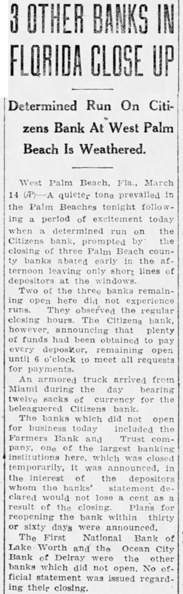 (By the Associated Press) West Palm Beach, Fla., March 14. -Three Palm Beach county banks failed to open their doors today while another local financial institution sought to check a critical run. The Farmers Bank Trust Company at West Palm Beach and the National Bank of Lakeworth and the Ocean City bank at Delray did not open for business this morning. The Citizens Bank of West Palm Beach was the object of a determined run.