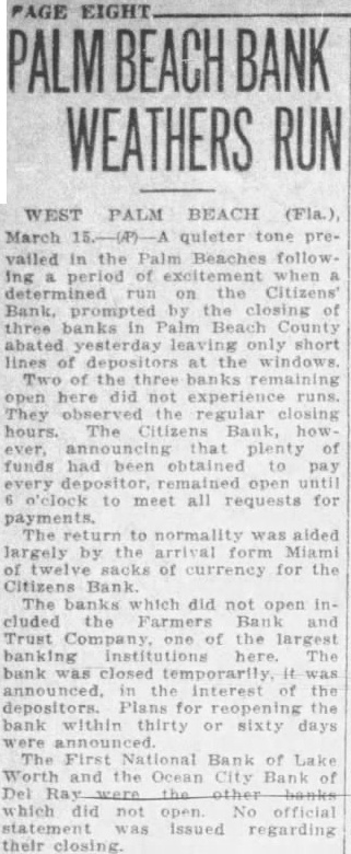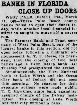 "By West Palm Beach, Fla., March 14. Three Palm Beach County banks to doors while financial Institution sought to stave off a severe The Farmers Bank and Trust Company of West Palm Beach, of the largest banks in this section, did not open today following midnight announcement by Reese, its that the closing two local Palm bank last Tuesday had precipitated the action