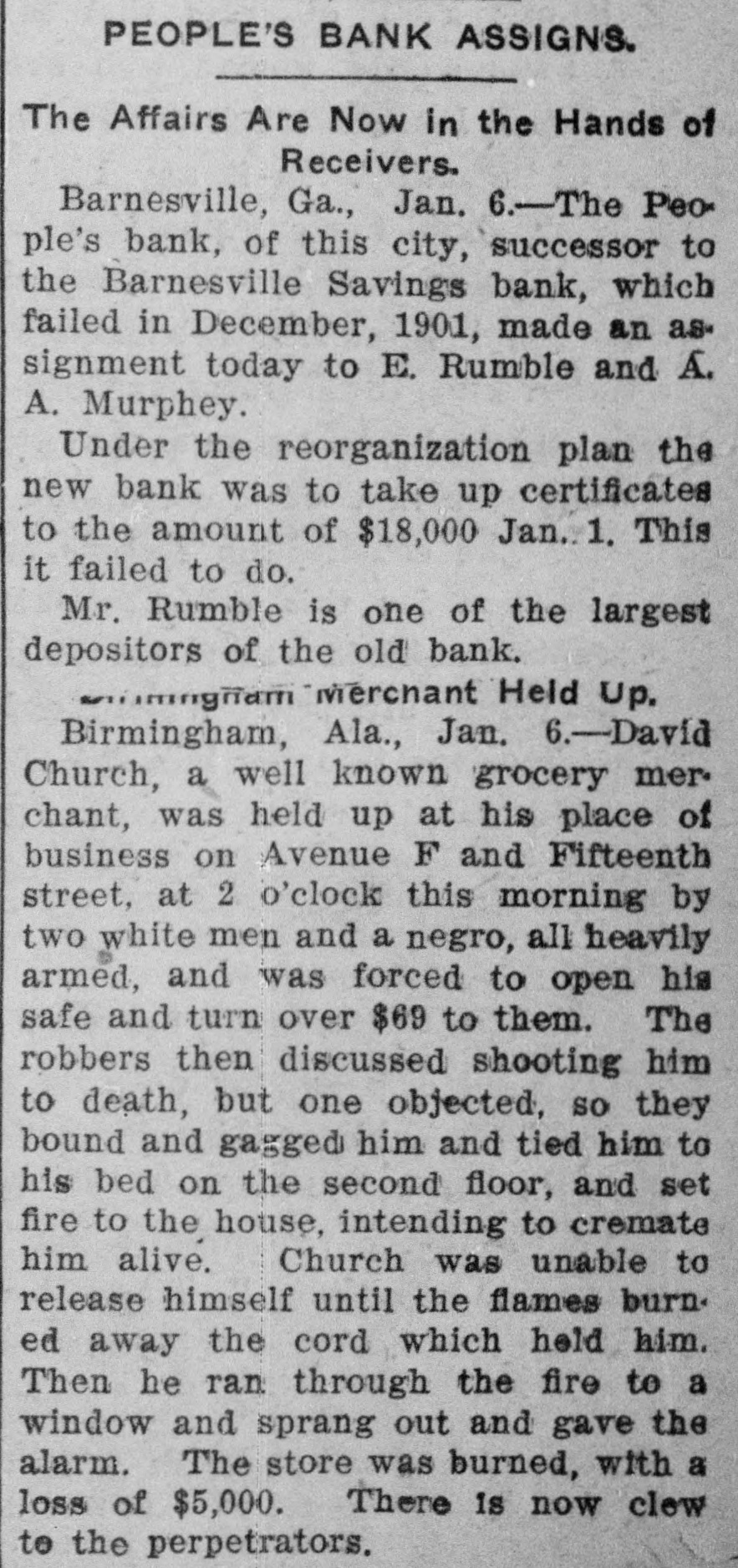 PEOPLE'S BANK ASSIGNS. The Affairs Are Now in the Hands of Receivers. Barnesville, Ga., Jan. 6.-The Peo ple's bank, of this city, successor to the Barnesville Savings bank, which failed in December, 1901, made an assignment today to E. Rumble and A. A. Murphey. Under the reorganization plan the new bank was to take up certificates to the amount of $18,000 Jan.. 1. This it failed to do. Mr. Rumble is one of the largest depositors of the old bank. wilmingnam merchant Held Up. Birmingham, Ala., Jan. 6.-David Church, a well known grocery merchant, was held up at his place of business on Avenue F and Fifteenth street, at 2 o'clock this morning by two white men and a negro, all heavily armed, and was forced to open his safe and turn over $69 to them. The robbers then discussed shooting him to death, but one objected, so they bound and gagged him and tied him to his bed on the second floor, and set fire to the house, intending to cremate him alive. Church was unable to release himself until the flames burn. ed away the cord which held him. Then he ran through the fire to a window and sprang out and gave the alarm. The store was burned, with a loss of $5,000. There is now clew to the perpetrators.