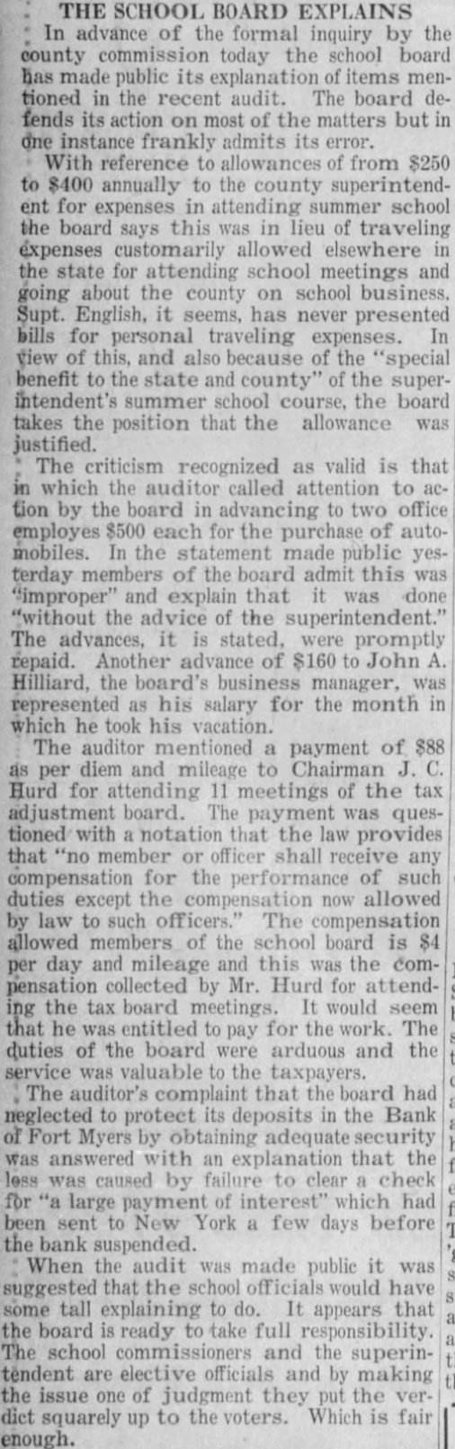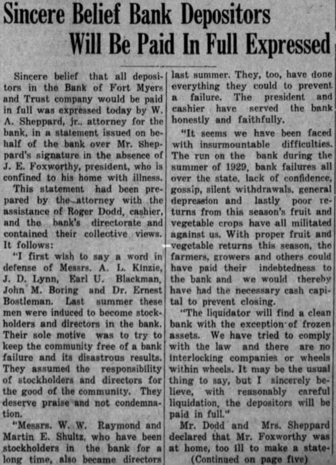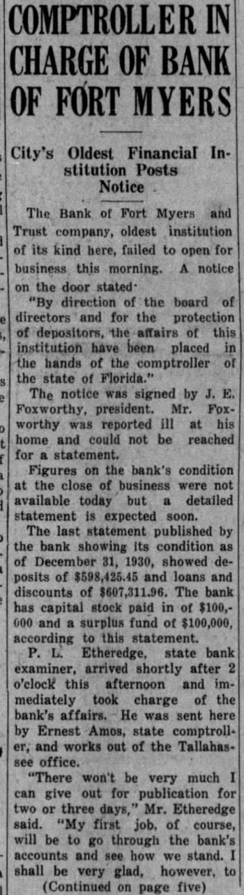 COMPTROLLER CHARGE OF BANK OF FORT MYERS City's Oldest Financial Institution Posts Notice The Bank of Fort Myers Trust company, oldest institution of its kind here, failed to open for business this morning. notice on the door stated "By direction of the board directors and for the protection depositors, affairs of this institution have been placed the hands of the comptroller the state of Florida." The notice was signed by Foxworthy, president. Mr. Foxworthy was reported ill at home and could not be reached for statement. Figures on the bank's condition at the close of business were not available today but detailed statement expected soon. The last statement published the bank showing its condition of December 31, 1930, showed posits of and loans and discounts of $607,311.96. The bank has capital stock paid in of $100,000 and surplus fund of $100,000, according to this statement. Etheredge, state bank examiner, arrived shortly after o'clock this afternoon and mediately took charge of the bank's affairs. He was sent here Ernest Amos, state comptrolland works out of the Tallahasoffice. "There won't be very much give out for publication for two or three Mr. Etheredge said. "My first job, of course, will be to go through the bank's accounts and see how we stand. shall be very glad, however, (Continued on page five)