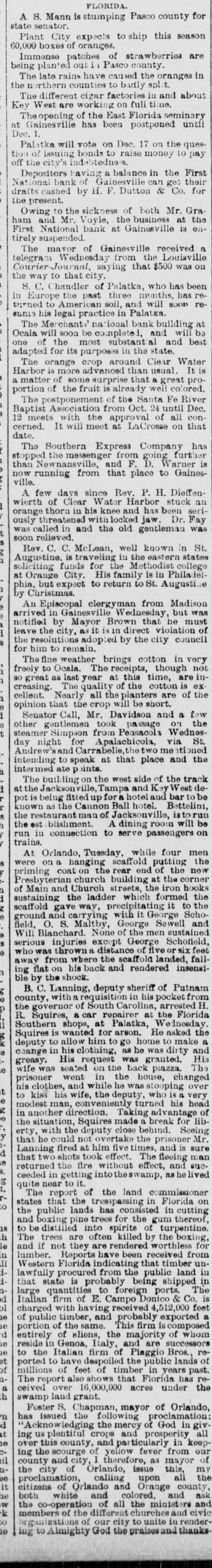for 8. A Pasco Mann county this season ship are the and about Key of the East Florida Theoponing at has been until Gainest postponed 17 on the on Dec. vote questo raise bonds issuing off the Depositors bank & for Co. Dutton drafts the present. its cashed by H. in the First of to Mr the both sickness Owing Mr the the ham and business Voyle, at First bank National Gainesville tirely suspended of The mayor received the telegra $500 Courier to the that way of been in to turned 80/11 The and will Ocala of one the for its adapted The Water orange more of matter of the portion The Santa Oct. until Baptist Association 12 of the meets with approval on LaCross It will cerned. date. The Southern 81 Gainesville, running from and F going to further H. Rev. days since now than opped A few Newnansville.com the Express that from place Company to Dieffenof Clear stuck wierth has been jaw Dr. old and gentleman soon relieved. in well known McLean, Rev. C. C. is traveling Augustine. for funds at Orange Augusti City, the in Philadelfrom Madison An Episcopal in but arrived Wednesday he must that by notified violation the council for him weather to freely time, quality of creasing. cellent. great as Ocala, The last year The brings at this cotton though no in Nearly the that opinion Mr. and Call, Senator other gentlement from Simpson Wednes steamer for day night intending of the and as known of est billshment run four trains. At in connection to room Orlando, Tuesday, on a were banging the on priming church esbyterian of Main Church the ladder sustaining gave scaffold and ground field, injuries from insensiing flat on ble of sheriff Putnam B. C. Lanning, of governor arrested R. car the repairer Florida Squires, at shops, Palatka. Southern is for He wanted Squires to to allow deputy in change greasy. was wife prisoner to his in for Seeing behind and The of the land The report the that states in the lands public the and gum to turpentine." The if and not lumber. Western public that state shipped large E. of firm Italian charged public of the portion of entirely of firm to have ported reside to the in Italian Genoa, aliens. Italy, the majority exported of of of millions report the under land swamp S. of Foster has n Orlando issued proclamation God and presper in from ing and city, mayor county of the this, Orlando, all upon Orlancelling proclamation. and of Orlando citizons and and both white of the k and in to unite our city to the and God ing praises thanks Almighty