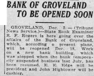 GROVELAND, Dec (Tribune News Bank Examiner R. F. Rogers is here going over the affairs of the Bank of Groveland. which according present plans, will be reopened Dec 18. Work new bank building which stopped when the bank temporarily suspended business last July, has resumed. Edge will and John Hightower will be