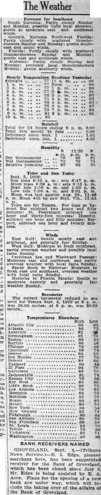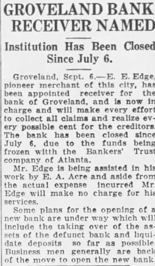 Groveland, Sept. 6.-E. E. Edge, merchant of this city, has been appointed receiver the bank of Groveland, and is now in charge and will make every effort to collect all claims and realize every possible cent for the creditors. The bank has been closed since July 6, due to the funds being frozen with the Bankers' Trust company of Atlanta. Mr. Edge is being assisted in his work by E. A. Acre and aside from the actual expense incurred Mr. Edge will make no charge for his services. Some plans for the opening of new bank are under way which will include the taking over of the assets of the defunct bank and hquidate far as possible Business men generally are back of the move to open the new bank.