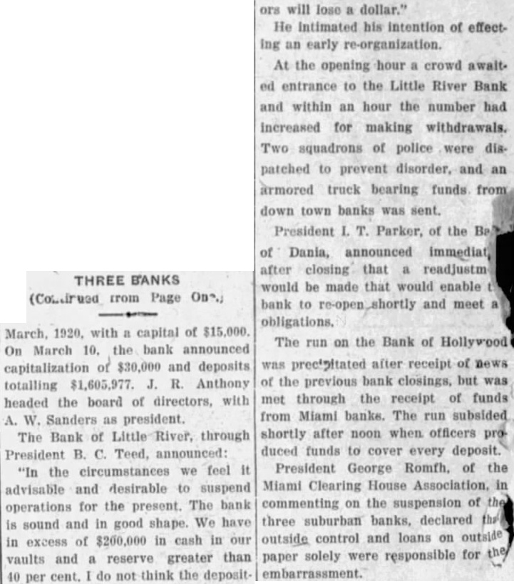 THREE BANKS from Page One, March, 1920. with capital of $15,000. On March 10. the bank announced capitalization of $30,000 and deposits totalling $1,605,977. R. Anthony headed the board of directors, with A. W. Sanders as president. The Bank of through President B. C. Teed, announced: "In the circumstances we feel advisable and desirable to suspend operations for the present. The bank is sound and in good shape. We have in excess of $200,000 in cash in our vaults and reserve greater than cent. do not think the depositper will lose dollar." He intimated his intention of effectIng an early re-organization. At the opening hour crowd await. entrance to the Little River Bank and within an hour the number had increased for making withdrawals. Two squadrons of police were dispatched to prevent disorder, and an armored truck bearing funds down town banks was sent. President Parker, of the of Dania, announced immediat after closing that readjustm would be made that would enable bank to and meet The run on the Bank of Hollywood was precipitated after receipt of news of the previous bank closings, but was met through the receipt of funds from Miami banks. The run subsided shortly after noon when officers duced funds to cover every deposit. President George Romfh. of the Miami Clearing House Association. in commenting on the suspension of three suburban banks, declared outside control and loans on solely were responsible for paper embarrassment.