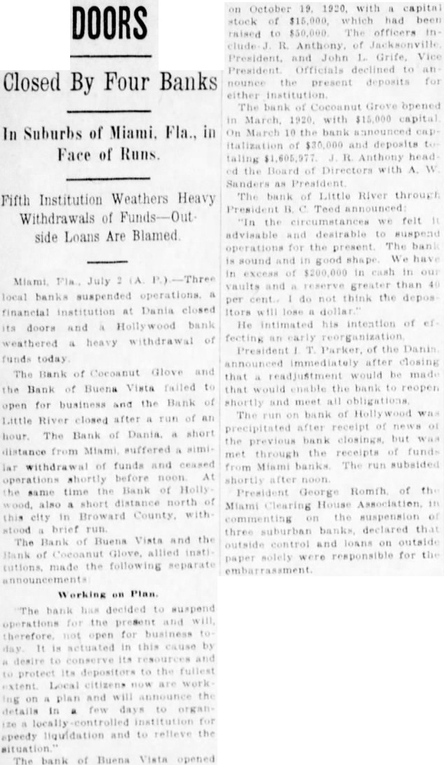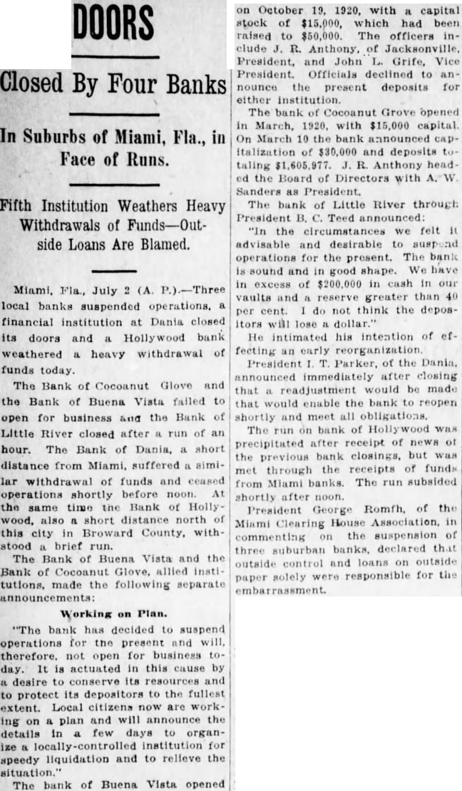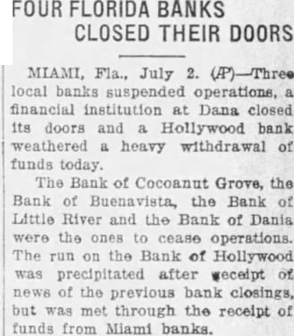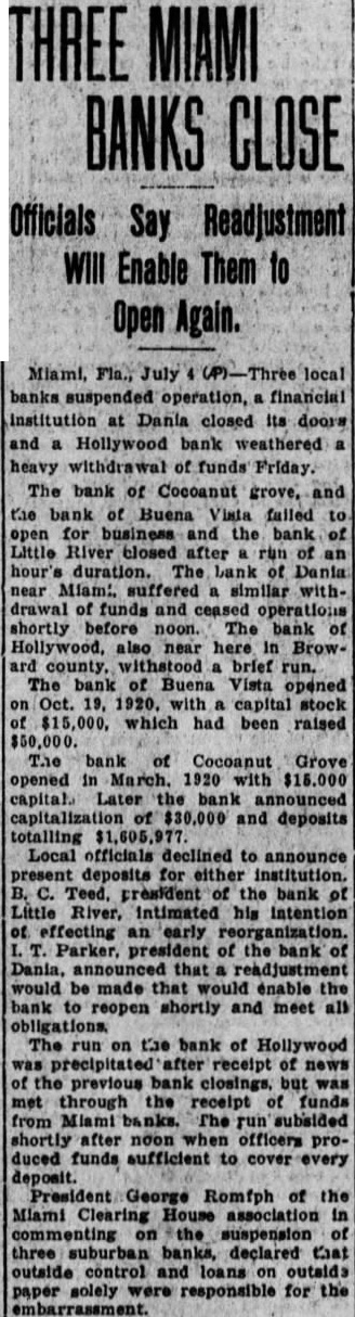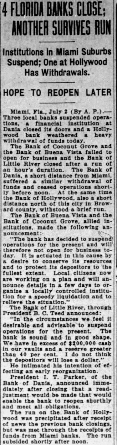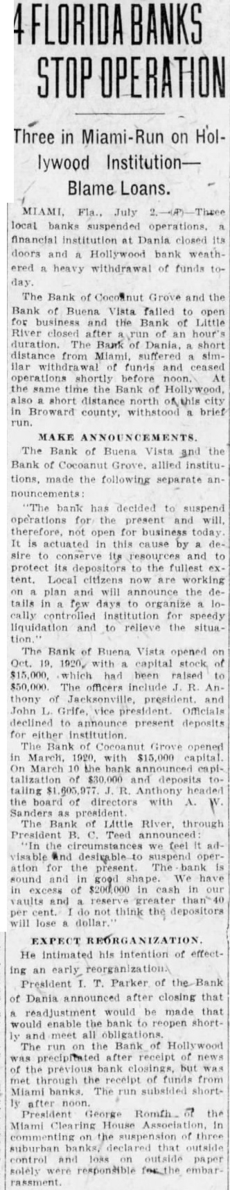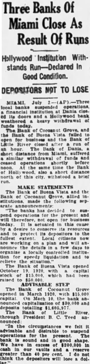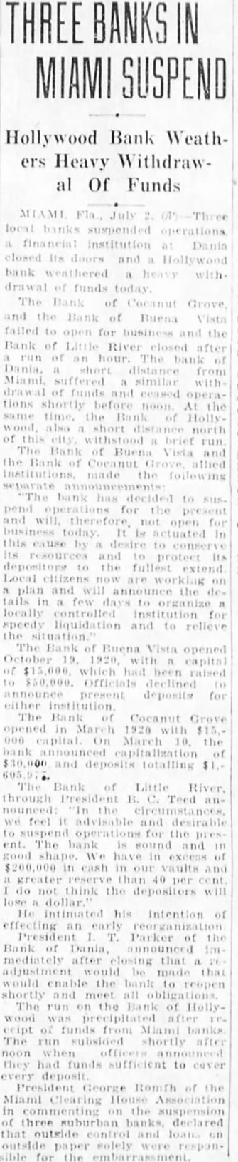 MIAMI July banks suspended operations financial institution Dania closed Its doors and Hollywood bank heavy drawal of funds today The of Grove the Bank of Buena failed to for and the Bank of after of an bank Miami. similar with of and ceased operations shortly before noon the same time. Bank Holly also short north of this brief The Bank of Buena Vista and the made the following "The bank has decided to for present and will therefore, not business today. It actuated in this cause by desire to and depositors the Local plan and will the tails in few organize locally for speedy liquidation and to relieve the The of Buena Vista opened capital of $15,000 raised $50,000. Officials declined present deposits for either The Bank Cocanut Grove opened in March 1920 $15.On March 10. the of $30,000 and totalling Bank Little River, through President B. Teed announced: we feel it advisable and desirable suspend operations for the present. The bank is and We of cash in vaults and 40 per do not think the depositors will dollar. He intimated his intention of effecting an President Parker of the of Dania, announced Immediately that adjustment be made that would enable the to reopen shortly and meet all The run on the Bank of Hollywood precipitated after reecipt of funds from Miami banks The run shortly after noon they had funds sufficient to cover George Romfh of the Miami Clearing House in commenting on the suspension of three suburban banks, declared that and loan. on sible for the embarrassment.