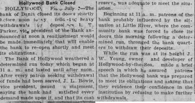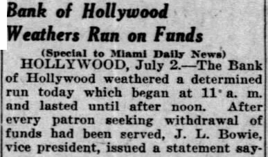 Beginning at 11 a. m. patrons of the bank probably influenced by the sit. uation at Little River, where the community bank was forced to close its doors this morning following determined run, thronged the bank quarters to withdraw their deposits. While the run was at its height J. W.. Young, owner and developer of Hollywood-by the-Sea, made a brief speech in which he assured patrons that the Hollywood bank was prepared to meet its obligations and asking that they evidence their confidence in the institution by refusing to make further