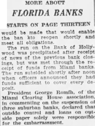 STARTS ON PAGE THIRTEEN would be made that would enable the ban kto reopen shortly and meet all obligations The run the Bank of Hollywood was precipitated receipt of the closings, but met through the ceipt of funds Miami banks The shortly after noon when officers they had funds sufficient to cover every dePresident George Romfh. of the Miami Clearing commenting the suburban declared that three outside loans on out. side paper solely responsible for the embarrassment.