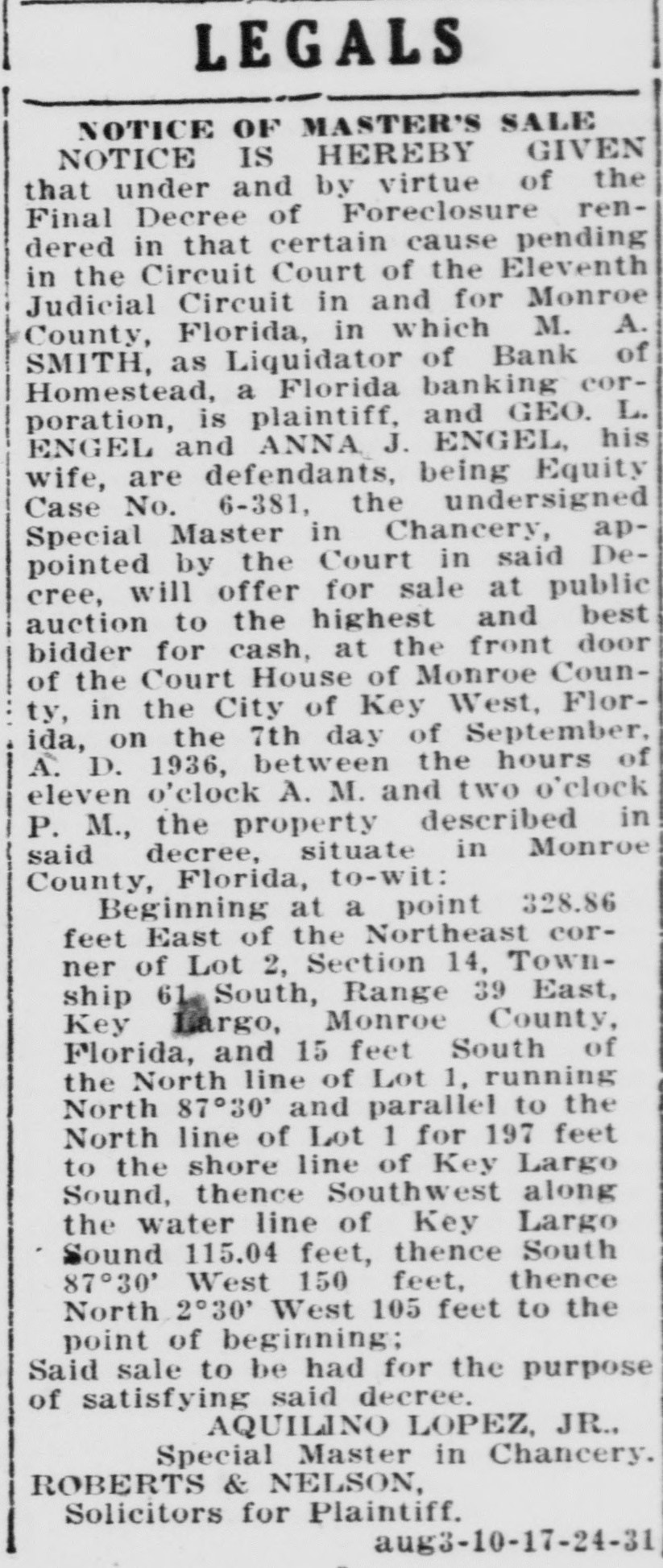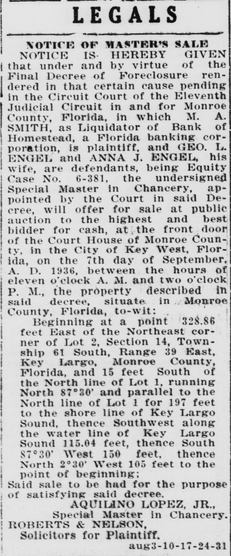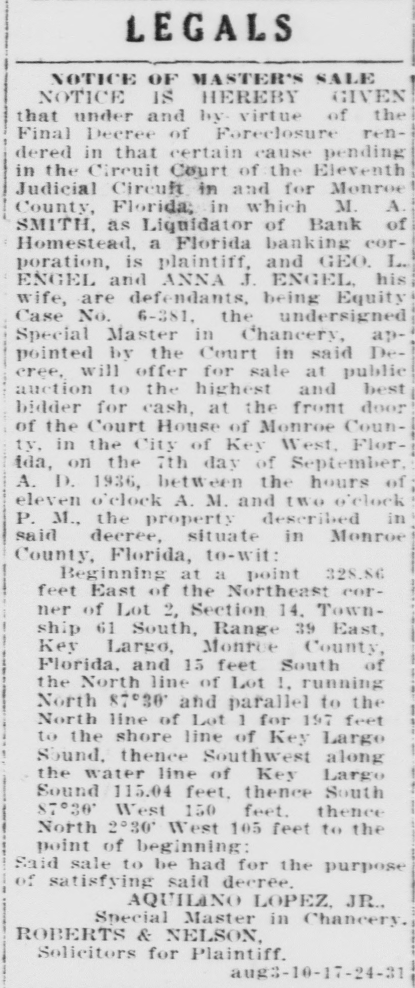 LEGALS NOTICE OF MASTER'S SALE NOTICE IS HEREBY GIVEN that under and by virtue of the Final Decree of Foreclosure rendered in that certain cause pending in the Circuit Court of the Eleventh Judicial Circuit in and for Monroe County, Florida, in which M. A. SMITH, as Liquidator of Bank of Homestead, a Florida banking corporation, is plaintiff, and GEO. L. ENGEL and ANNA J. ENGEL, his wife, are defendants, being Equity Case No. 6-381, the undersigned Special Master in Chancery, appointed by the Court in said Decree, will offer for sale at public auction to the highest and best bidder for cash, at the front door of the Court House of Monroe County, in the City of Key West, Florida, on the 7th day of September, A. D. 1936, between the hours of eleven o'clock A. M. and two o'clock P. M., the property described in said decree, situate in Monroe County, Florida, to-wit: Beginning at a point 328.86 feet East of the Northeast corner of Lot 2, Section 14, Township 61 South, Range 39 East, Key Largo, Monroe County, Florida, and 15 feet South of the North line of Lot 1, running North 87°30' and parallel to the North line of Lot 1 for 197 feet to the shore line of Key Largo Sound, thence Southwest along the water line of Key Largo Sound 115.04 feet, thence South 87°30' West 150 feet, thence North 2°30' West 195 feet to the point of beginning: Said sale to be had for the purpose of satisfying said decree. AQUILINO LOPEZ, JR., Special Master in Chancery. ROBERTS & NELSON, Solicitors for Plaintiff. aug3-10-17-24-31