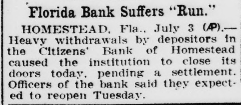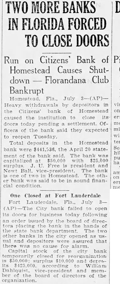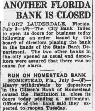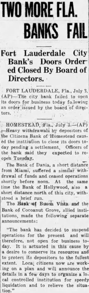 BANKS FAIL its doors for business today following an order issued by the board of directors. -Heavy withdrawals by depositors of the Citizens Bank of Homestead caused the insttiution to close its doors today pending settlement. Officers of the bank said they expected to reopen Tuesday. The Bank of Dania, a short distance from Miami, suffered a similar withdrawal of funds and ceased operations shortly before noon. At the same time the Bank of Hollywood, also a short distance north of this city, withstood brief run. The Bank Buena Vista and the Bank of Cocoanut Grove, allied institutions, made the following separate announcements: "The bank has decided to suspend operations for the present and will therefore, not open for business today. It is actuated in this cause by desire to conserve its resources and to protect its depositors to the fullest extent. Local citizens now are working on a plan and will announce the details in few days to organize a local controlled institution for speedy liquidation and to relieve the situation."