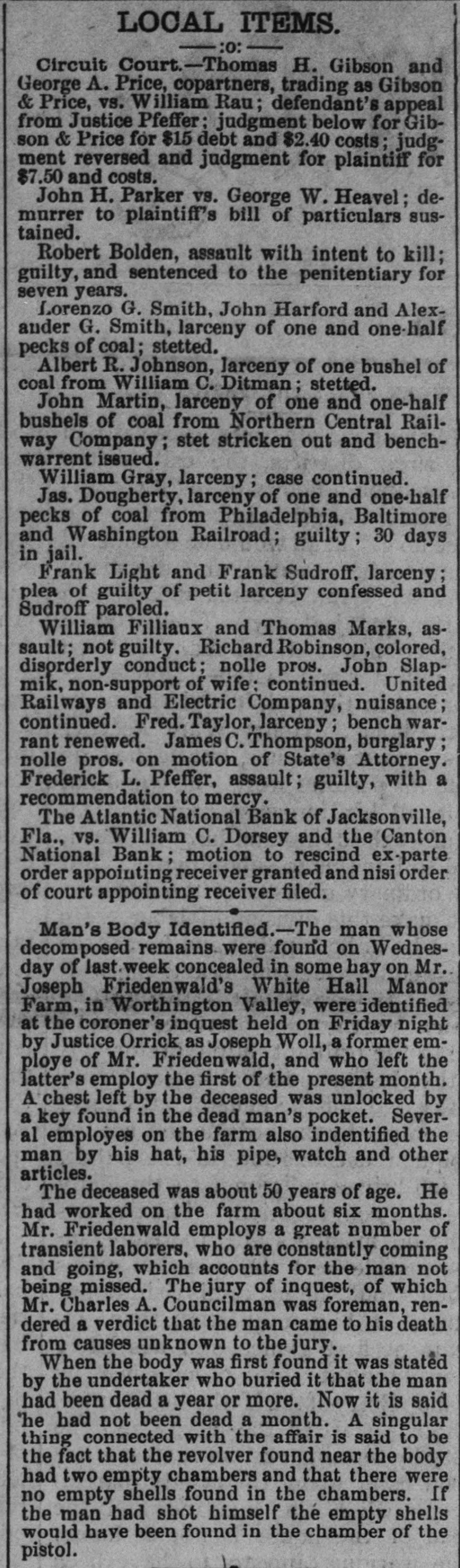 # LOCAL ITEMS. Circuit Court. -Thomas H. Gibson and George A. Price, copartners, trading as Gibson & Price, vs. William Rau; defendant's appeal from Justice Pfeffer; judgment below for Gibson & Price for $15 debt and $2.40 costs; judgment reversed and judgment for plaintiff for $7.50 and costs. John H. Parker vs. George W. Heavel; demurrer to plaintiff's bill of particulars sustained. Robert Bolden, assault with intent to kill; guilty, and sentenced to the penitentiary for seven years. Lorenzo G. Smith, John Harford and Alexander G. Smith, larceny of one and one-half pecks of coal; stetted. Albert R. Johnson, larceny of one bushel of coal from William C. Ditman; stetted. John Martin, larceny of one and one-half bushels of coal from Northern Central Railway Company; stet stricken out and bench-warrent issued. William Gray, larceny; case continued. Jas. Dougherty, larceny of one and one-half pecks of coal from Philadelphia, Baltimore and Washington Railroad; guilty: 30 days in jail. Frank Light and Frank Sudroff, larceny; plea of guilty of petit larceny confessed and Sudroff paroled. William Filliaux and Thomas Marks, assault; not guilty. Richard Robinson, colored, disorderly conduct; nolle pros. John Slapmik, non-support of wife: continued. United Railways and Electric Company, nuisance; continued. Fred. Taylor, larceny; bench warrant renewed. James C. Thompson, burglary; nolle pros. on motion of State's Attorney. Frederick L. Pfeffer, assault; guilty, with a recommendation to mercy. The Atlantic National Bank of Jacksonville, Fla., vs. William C. Dorsey and the Canton National Bank; motion to rescind ex-parte order appointing receiver granted and nisi order of court appointing receiver filed. # MAN'S BODY IDENTIFIED. The man whose decomposed remains were found on Wednesday of last week concealed in some hay on Mr. Joseph Friedenwald's White Hall Manor Farm, in Worthington Valley, were identified at the coroner's inquest held on Friday night by Justice Orrick as Joseph Woll, a former employe of Mr. Friedenwald, and who left the latter's employ the first of the present month. A chest left by the deceased was unlocked by a key found in the dead man's pocket. Several employes on the farm also indentified the man by his hat, his pipe, watch and other articles. The deceased was about 50 years of age. He had worked on the farm about six months. Mr. Friedenwald employs a great number of transient laborers, who are constantly coming and going, which accounts for the man not being missed. The jury of inquest, of which Mr. Charles A. Councilman was foreman, rendered a verdict that the man came to his death from causes unknown to the jury. When the body was first found it was stated by the undertaker who buried it that the man had been dead a year or more. Now it is said 'he had not been dead a month. A singular thing connected with the affair is said to be the fact that the revolver found near the body had two empty chambers and that there were no empty shells found in the chambers. If the man had shot himself the empty shells would have been found in the chamber of the pistol.
