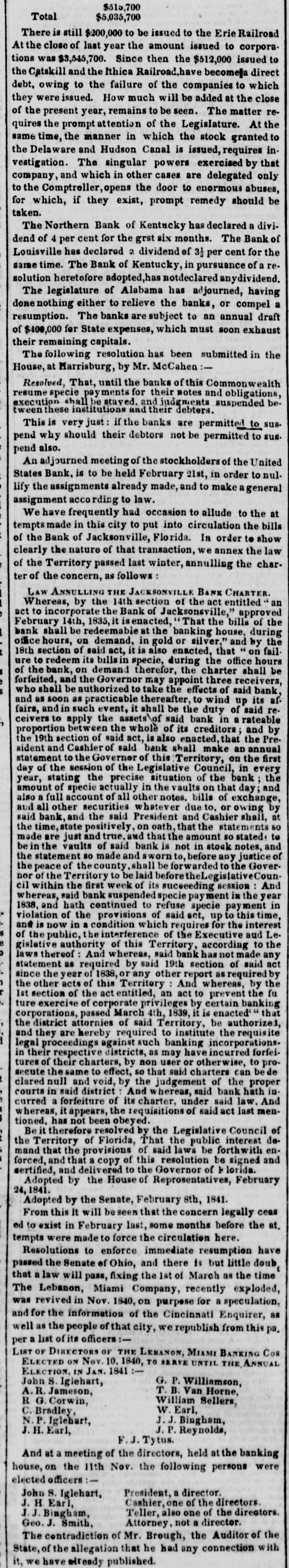the close of last year the amount issued to corporations was $3,545,700. Since then the $512,000 issued to the Catskill and the Ithica Railroad,hi becomeja direct debt, owing to the failure of the companies to which they were issued. How much will be added at the close of the present year, remains to be seen. The matter requires the prompt attention of the Legislature. At the same time, the manner in which the stock granted to the Delaware and Hudson Canal is issued, requires in vestigation. The singular powers exercised by that company, and which in other cases are delegated only to the Comptreller, opens the door to enormous abuses, for which, if they exist, prompt remedy should be taken. The Northern Bank of Kentucky has declared a diviof dend of 4 per cent for the grst six months. The Bank Louisville has declared 2 dividend of 3 per cent for the same time. The Bank of Kentucky, in pursuance of a resolution heretofore adopted,has notdeclared anydividend. The legislature of Alabama has adjourned, having e no thing either to relieve the banks, or compel resumption. The banks are subject to an annual draft of $400,000 for State expenses, which must soon exhaust their remaining capitals. The following resolution has been submitted in the House, at Marrisburg, by Mr. McCahen : Resolved, That, until the banks of this Commonwealth resume specie payments for their notes and obligations, execution shall be stayed. and judgments suspended between these institutions and their debters. This is very just: if the banks are permitted to suspend why should their debtors not be permitted to sus. pend also. An adjourned meeting of the stockholders of the United States Bank, is to be held February 21st, in order to nul. lify the assignments already made, and to make a general assignment according to law. We have frequently had occasion to allude to the at tempts made in this city to put into circulation the bills of the Bank of Jacksonville, Florida. In order to show clearly the nature of that transaction, we annex the law of the Territory passed last winter, annulling the charter of the concern, as follows LAW ANNULLING THE JACKSONVILLE BANK CHARTER. Whereas, by the 14th section of the act entitled an act to incorporate the Bank of Jacksonsville, approved February 14th, 1835, it enacted, That the bills of the bank shall be redeemable at the banking house, during office hours, on demand, in gold or silver," and by the 18th section of said act, it is also enacted, that on fail ure to redeem its billsin specie, during the office hours be of the bank, on demand therefor, the charter shall forfeited, and the Governor may appoint three receivers, who shall be authorized to take the effects of said bank and as soon as practicable thereafter, to wind up its af fairs, and in such event, it shall be the duty of said receivers to apply the assets\of said bank in a rateable proportion between the whole of its creditors and by the 19th section of said act, is also enacted, that the President and Cashier of said bank shall make an annual statement to the Governor of this Territory, on the first day of the session of the Legislative Council, in every year, stating the precise situation of the bank the amount of specie actually in the vaults on that day and also a full account of all other notes. bills of exchange, aud all other securities whatever due to, or owing by said bank, and the said President and Cashier shall, at the time, state positively, on oath, that the statements so made are just and true, and that the amount so stated to be the vaults of said bank is not in stock notes, and the statement so made and sworn to, beforeany justice of the peace of the county, shall be forwarded to the Governor of the Territory to be laid before theLegislativeCoun cil within the first week of its suceeeding session : And whereas, said bank suspended specie payment in the year 1838, and hath continued to refuse specie payment in violation of the provisions of said act, up to this time, and is now in a condition which requires for the interest of the public, the interference of the Executive aud Legislative authority of this Territory, according to the laws thereof : And whereas, said bank has not made any statement as required by said 19th section of said act since the year of 1838, or any other report as required by the other acts of this Territory : And whereas, by the 1st section of the act entitled, an act to prevent the fu ture exercise of corporate privileges by certain banking corporations, passed March 4th, 1839, it is enacted that the district attornies of said Territory, be authorized, and they are hereby required to institute the requisite legal proceedings against such banking incorporations. in their respective districts, as may have incurred forfeitures of their charters, by non user or otherwise, to prosecute the same to effect, so that said charters can be de clared null and void, by the judgement of the proper courts in said district And whereas, said bank hath in curred a forfeiture of its charter, under said law. And whereas, it appears, the requisitions of said act last mentioned. has not been obeyed. Be it therefore resolved by the Legislative Council of the Territory of Florida, That the public interest demand that the provisions of said laws be forthwith enforced, and that a copy of this resolution be signed and certified, and delivered to the Governor of lorida. Adopted by the House of Reprosentatives, February 1,1841. Adopted by the Senate, February 8th, 1841. From this It will be seen that the concern legally ceas ed to exist in February last, some months before the at. tempts were made to force the circulation here. Resolutions to enforce immediate resumption have passed the Senate of Ohio, and there is but little doub, that a law will pass, fixing the 1st of March as the time The Lebanon, Miami Company, recently exploded, was revived in Nov. 1840, on purpose for a speculation, and for the informat