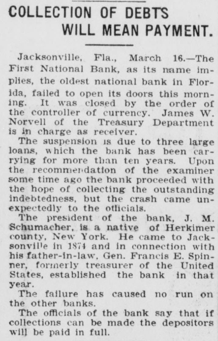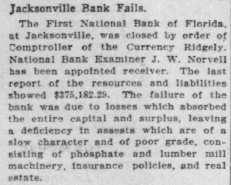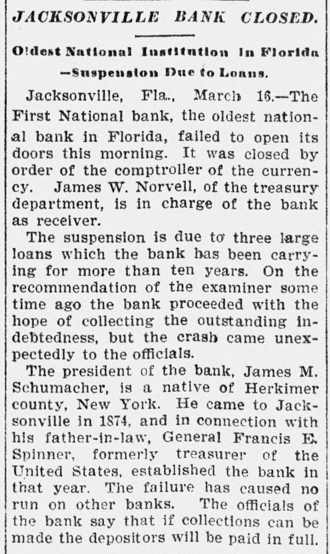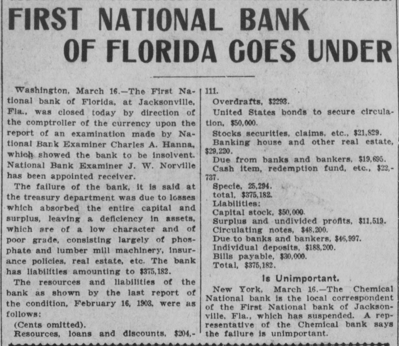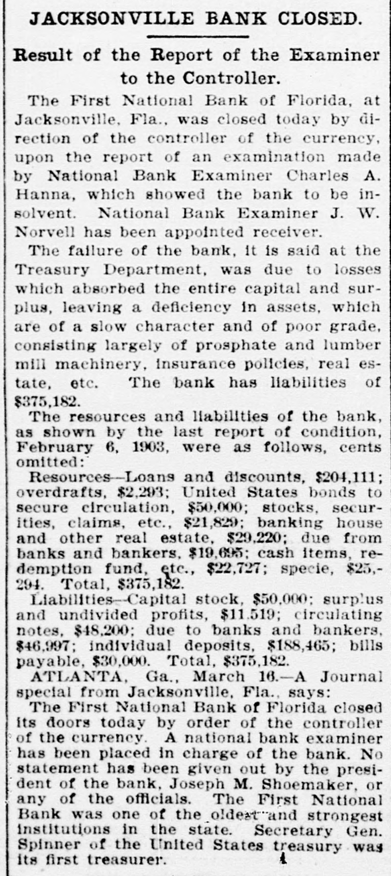 JACKSONVILLE BANK CLOSED. Result of the Report of the Examiner to the Controller. The First National Bank of Florida, at Jacksonville, Fla., was closed today by direction of the controller of the currency, upon the report of an examination made by National Bank Examiner Charles A. Hanna, which showed the bank to be insolvent. National Bank Examiner J. W. Norvell has been appointed receiver. The failure of the bank, it is said at the Treasury Department, was due to losses which absorbed the entire capital and surplus, leaving a deficiency in assets, which are of a slow character and of poor grade, consisting largely of prosphate and lumber mill machinery, insurance policies, real estate, etc. The bank has liabilities of $375,182. The resources and liabilities of the bank, as shown by the last report of condition, February 6, 1903, were as follows, cents omitted: Resources-Loans and discounts, $204,111; overdrafts, $2,293; United States bonds to secure circulation, $50,000; stocks, securities, claims, etc., $21,829; banking house and other real estate, $29,220; due from banks and bankers, $19,695; cash items, redemption fund, etc., $22,727; specie, $25,294. Total, $375,182. Liabilities--Capital stock, $50,000; surplus and undivided profits, $11.519; circulating notes, $48,200; due to banks and bankers, $46,997; individual deposits, $188,465; bills payable, $30,000. Total, $375,182. ATLANTA, Ga., March 16.-A Journal special from Jacksonville, Fla., says: The First National Bank of Florida closed its doors today by order of the controller of the currency. A national bank examiner has been placed in charge of the bank. No statement has been given out by the president of the bank, Joseph M. Shoemaker, or any of the officials. The First National Bank was one of the oldest and strongest institutions in the state. Secretary Gen. Spinner of the United States treasury was A its first treasurer.