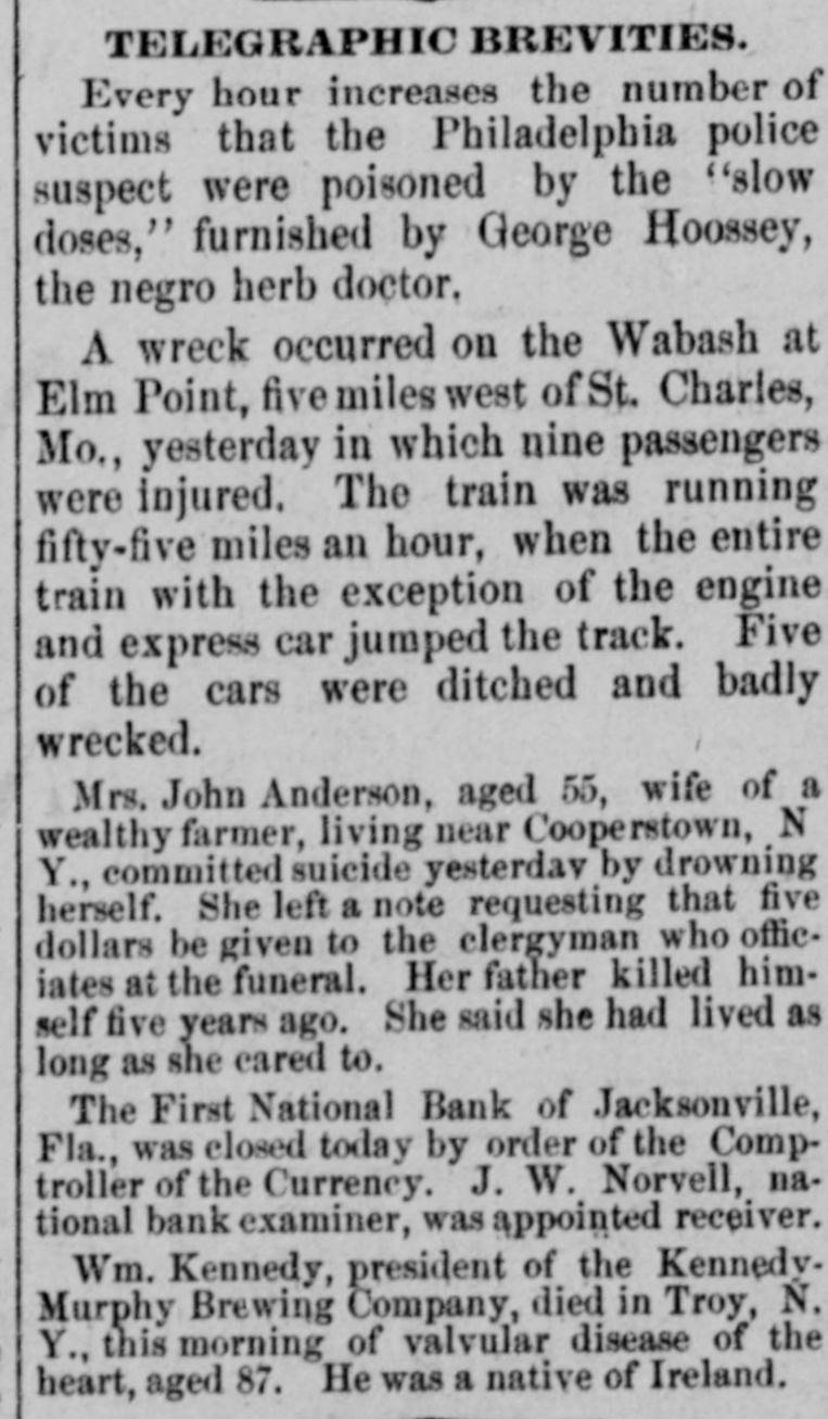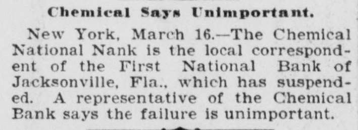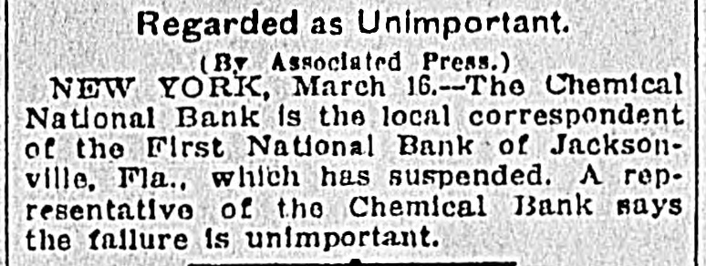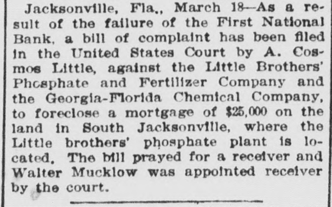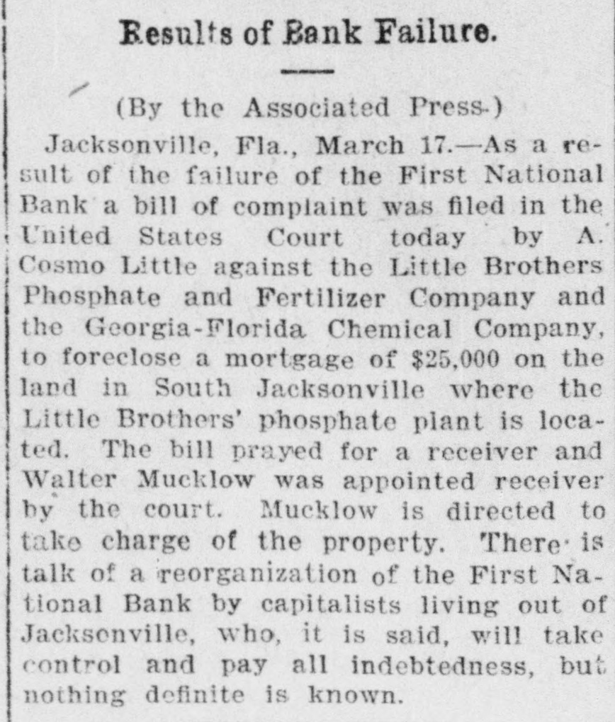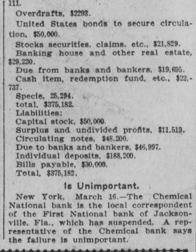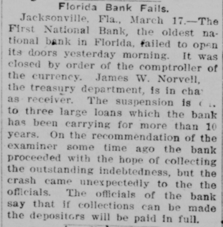 JACKSONVILLE BANK CLOSED. Result of the Report of the Examiner to the Controller. The First National Bank of Florida, at Jacksonville, Fla., was closed today by direction of the controller of the currency, upon the report of an examination made by National Bank Examiner Charles A. Hanna, which showed the bank to be insolvent. National Bank Examiner J. W. Norvell has been appointed receiver. The failure of the bank, it is said at the Treasury Department, was due to losses which absorbed the entire capital and surplus, leaving a deficiency in assets, which are of a slow character and of poor grade, consisting largely of prosphate and lumber mill machinery, insurance policies, real estate, etc. The bank has liabilities of $375,182. The resources and liabilities of the bank, as shown by the last report of condition, February 6, 1903, were as follows, cents omitted: Resources-Loans and discounts, $204,111; overdrafts, $2,293; United States bonds to secure circulation, $50,000; stocks, securities, claims, etc., $21,829; banking house and other real estate, $29,220; due from banks and bankers, $19,695; cash items, redemption fund, etc., $22,727; specie, $25,294. Total, $375,182. Liabilities--Capital stock, $50,000; surplus and undivided profits, $11.519; circulating notes, $48,200; due to banks and bankers, $46,997; individual deposits, $188,465; bills payable, $30,000. Total, $375,182. ATLANTA, Ga., March 16.-A Journal special from Jacksonville, Fla., says: The First National Bank of Florida closed its doors today by order of the controller of the currency. A national bank examiner has been placed in charge of the bank. No statement has been given out by the president of the bank, Joseph M. Shoemaker, or any of the officials. The First National Bank was one of the oldest and strongest institutions in the state. Secretary Gen. Spinner of the United States treasury was A its first treasurer.