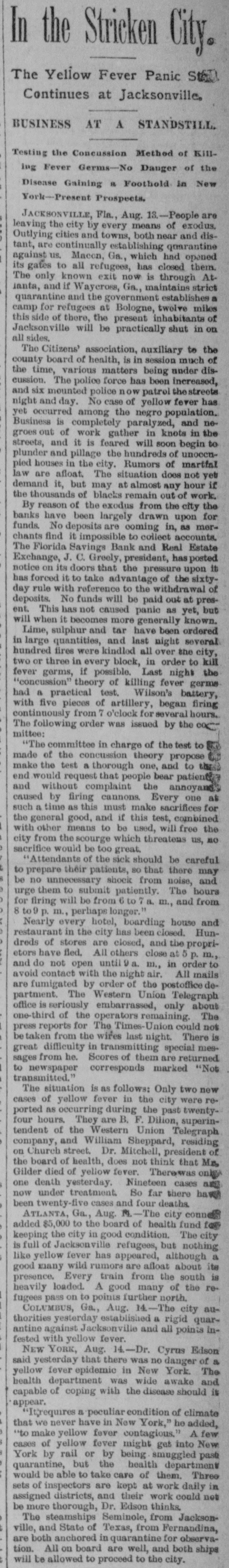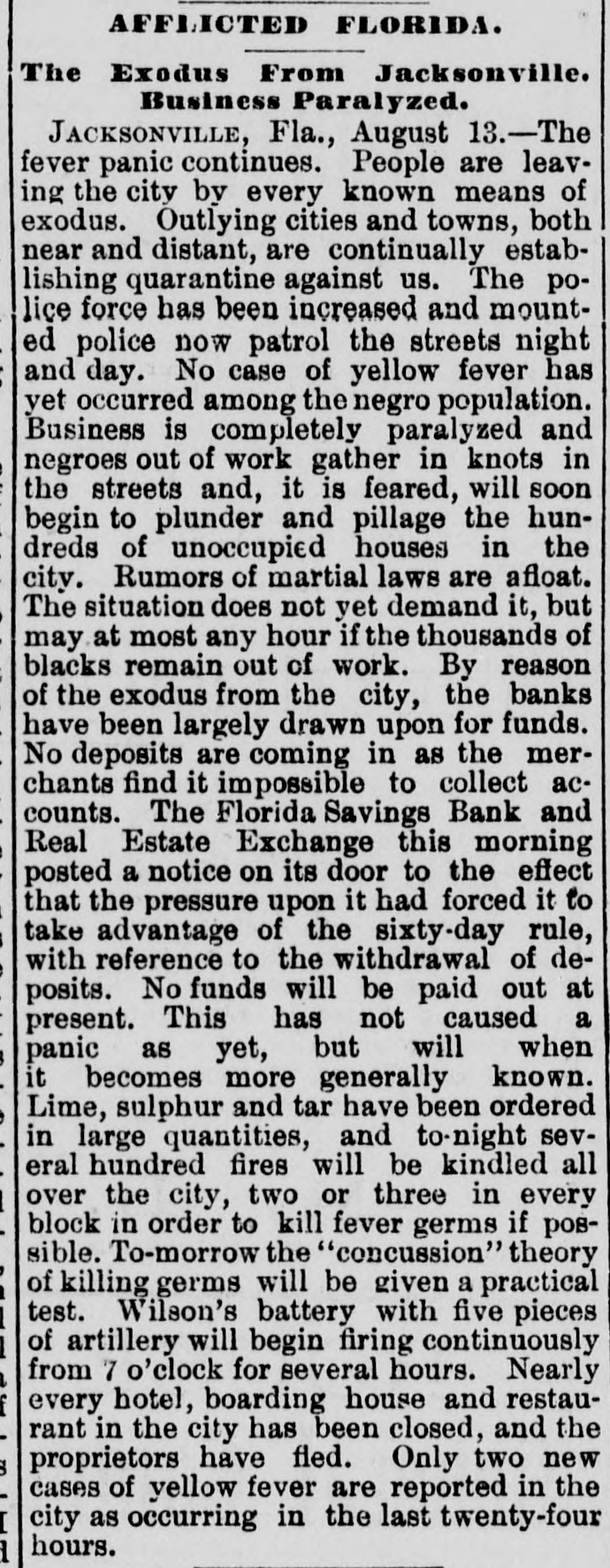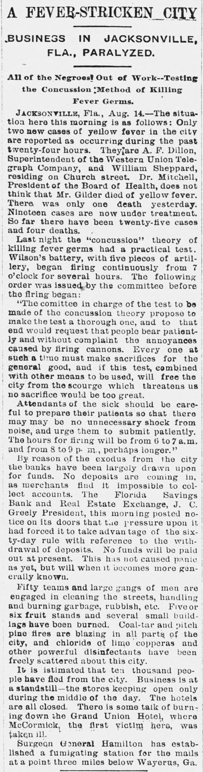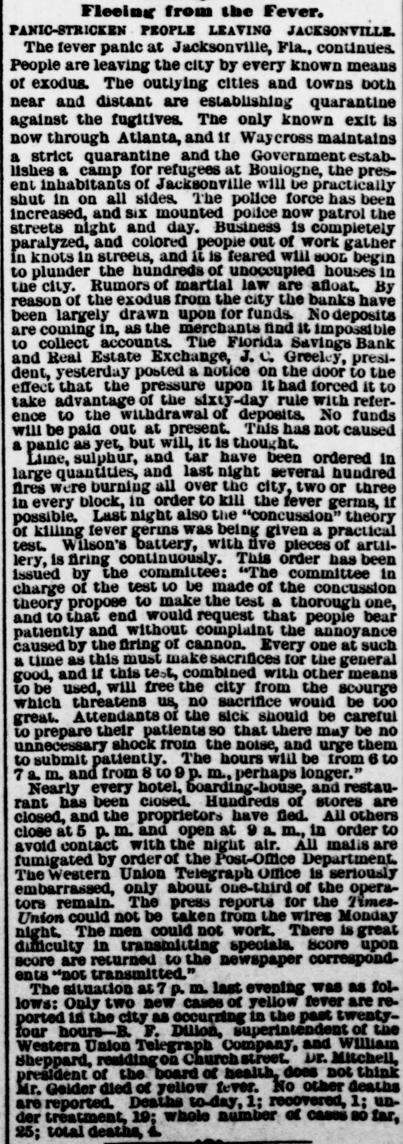 Fleeing from the Fever. PANIC-STRICKEN PEOPLE LEAVING JACKSONVILLE. The fever panic at Jacksonville, Fla., continues. People are leaving the city by every known means or exodus. The outlying cities and towns both near and distant are establishing quarantine against the fugitives. The only known exit is now through Atlanta, and If Wayeross maintains a strict quarantine and the Government establishes a camp for refugees at Boulogne, the pres. ent inhabitants of Jacksonville will be practically shut in on all sides. The police force has been increased, and six mounted police now patrol the streets night and day. Business is completely paralyzed, and colored people out of work gather in knots in streets, and it is feared will SOOL begin to plunder the hundreds of unoccupied houses in the city. Rumors of martial law are afloat. By reason of the exodus from the city the banks have been largely drawn upon for funds. No deposits are coming in, as the merchants find it impossible to collect accounts. The Florida Savings Bank and Real Estate Exchange, J. C. Greeley, president, yesterday posted a notice on the door to the effect that the pressure upon it had forced it to take advantage of the sixty-day rule with reference to the withdrawal of deposits. No funds will be paid out at present. This has not caused a panic as yet, but will, it is thought. Line, sulphur, and tar have been ordered in large quantities, and last night several hundred fires were burning all over the city, two or three in every block, in order to kill the fever germs, If possible. Last night also the "concussion" theory of killing fever germs was being given a practical test. Wilson's battery, with tive pieces of artillery, is firing continuously. This order has been issued by the committee: "The committee in charge of the test 10 be made of the concussion theory propose to make the test a thorough one, and to that end would request that people bear patiently and without complaint the annoyance caused by the firing of cannon. Every one at such & time as this must make sacrifices for the general good, and If this test, combined with other means to be used, will free the city from the scourge which threatens us, no sacrifice would be too great. Attendants or the sick should be careful to prepare their patients so that there may be no unnecessary shock from the noise, and urge them to submit patiently. The hours will be from 6 to a. m. and from 8 to p. m., perhaps longer." Nearly every hotel, boarding-house, and restaurant has been closed. Hundreds or stores are closed, and the proprietors have fied. All others close at 5 p. m. and open at 9 a. m., in order to avoid contact with the night air. All malis are fumigated by order of the Post-Office Department. The Western Union Telegraph Office is seriously embarrassed, only about one-third of the operators remain. The press reports for the TimesUnion could not be taken from the wires Monday night. The men could not work. There is great difficulty in transmiting specials. Score upon score are recurred to the newspaper correspondents "not transmitted." The situation at 7 p. m. last evening was as for lows: Only two new cases of yellow fever are reported in the city as occurring in the past twentyfour hours-B. F. Dillon, superintendent of the Western Union Telegraph Company, and William Sheppard, residingo Church street. Dr. Mitchell, president of the board of health, does not think Mr. Gelder died of yellow fever. No other deaths are reported. Deaths to-day, 1; recovered, 1; under treatment, 19; whole number or cases so far, 25; total deaths, s