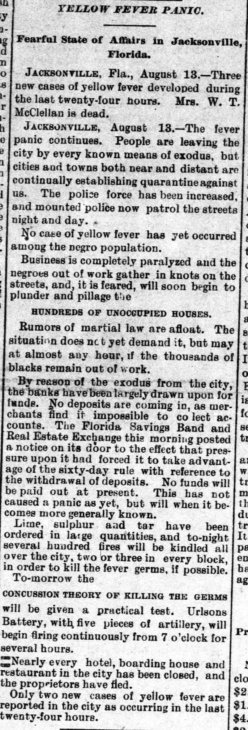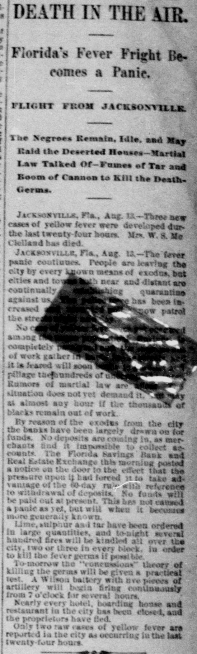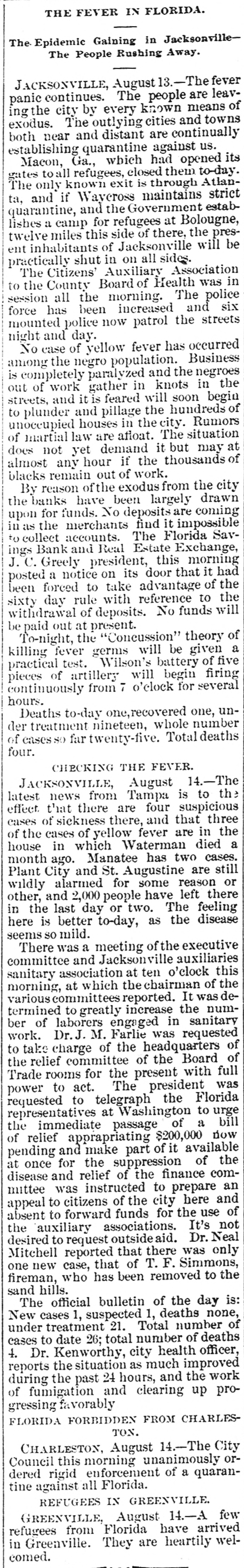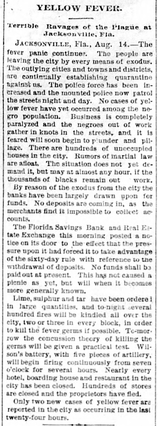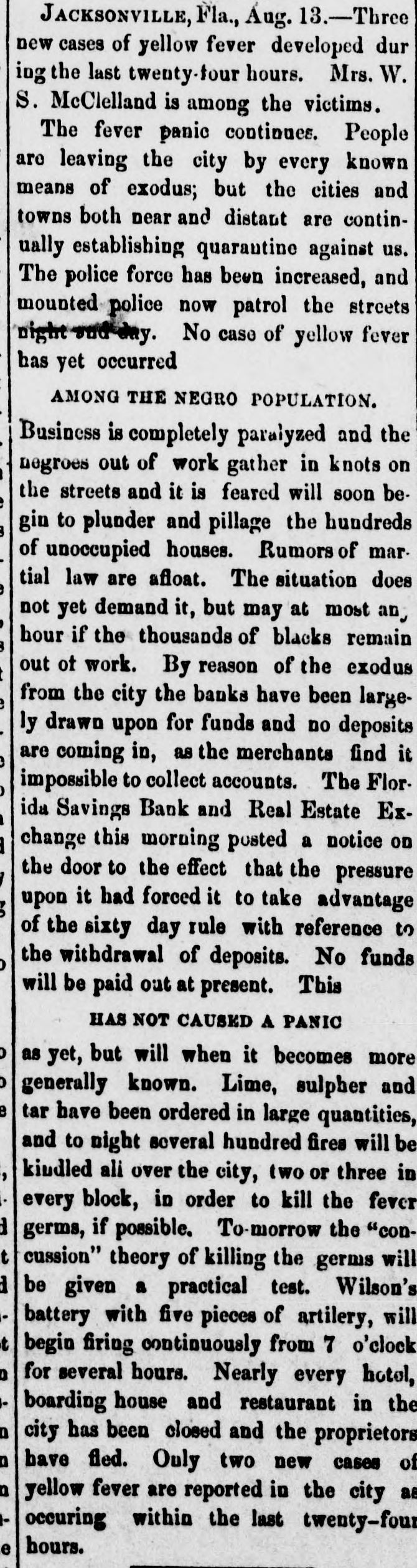 Fleeing from the Fever. PANIC-STRICKEN PEOPLE LEAVING JACKSONVILLE. The fever panic at Jacksonville, Fla., continues. People are leaving the city by every known means or exodus. The outlying cities and towns both near and distant are establishing quarantine against the fugitives. The only known exit is now through Atlanta, and If Wayeross maintains a strict quarantine and the Government establishes a camp for refugees at Boulogne, the pres. ent inhabitants of Jacksonville will be practically shut in on all sides. The police force has been increased, and six mounted police now patrol the streets night and day. Business is completely paralyzed, and colored people out of work gather in knots in streets, and it is feared will SOOL begin to plunder the hundreds of unoccupied houses in the city. Rumors of martial law are afloat. By reason of the exodus from the city the banks have been largely drawn upon for funds. No deposits are coming in, as the merchants find it impossible to collect accounts. The Florida Savings Bank and Real Estate Exchange, J. C. Greeley, president, yesterday posted a notice on the door to the effect that the pressure upon it had forced it to take advantage of the sixty-day rule with reference to the withdrawal of deposits. No funds will be paid out at present. This has not caused a panic as yet, but will, it is thought. Line, sulphur, and tar have been ordered in large quantities, and last night several hundred fires were burning all over the city, two or three in every block, in order to kill the fever germs, If possible. Last night also the "concussion" theory of killing fever germs was being given a practical test. Wilson's battery, with tive pieces of artillery, is firing continuously. This order has been issued by the committee: "The committee in charge of the test 10 be made of the concussion theory propose to make the test a thorough one, and to that end would request that people bear patiently and without complaint the annoyance caused by the firing of cannon. Every one at such & time as this must make sacrifices for the general good, and If this test, combined with other means to be used, will free the city from the scourge which threatens us, no sacrifice would be too great. Attendants or the sick should be careful to prepare their patients so that there may be no unnecessary shock from the noise, and urge them to submit patiently. The hours will be from 6 to a. m. and from 8 to p. m., perhaps longer." Nearly every hotel, boarding-house, and restaurant has been closed. Hundreds or stores are closed, and the proprietors have fied. All others close at 5 p. m. and open at 9 a. m., in order to avoid contact with the night air. All malis are fumigated by order of the Post-Office Department. The Western Union Telegraph Office is seriously embarrassed, only about one-third of the operators remain. The press reports for the TimesUnion could not be taken from the wires Monday night. The men could not work. There is great difficulty in transmiting specials. Score upon score are recurred to the newspaper correspondents "not transmitted." The situation at 7 p. m. last evening was as for lows: Only two new cases of yellow fever are reported in the city as occurring in the past twentyfour hours-B. F. Dillon, superintendent of the Western Union Telegraph Company, and William Sheppard, residingo Church street. Dr. Mitchell, president of the board of health, does not think Mr. Gelder died of yellow fever. No other deaths are reported. Deaths to-day, 1; recovered, 1; under treatment, 19; whole number or cases so far, 25; total deaths, s