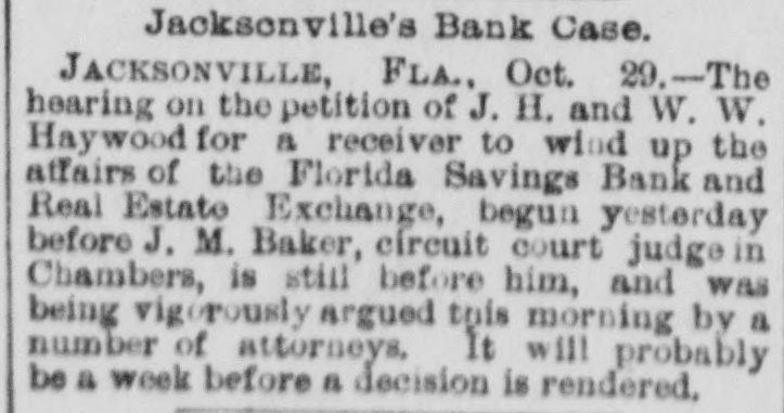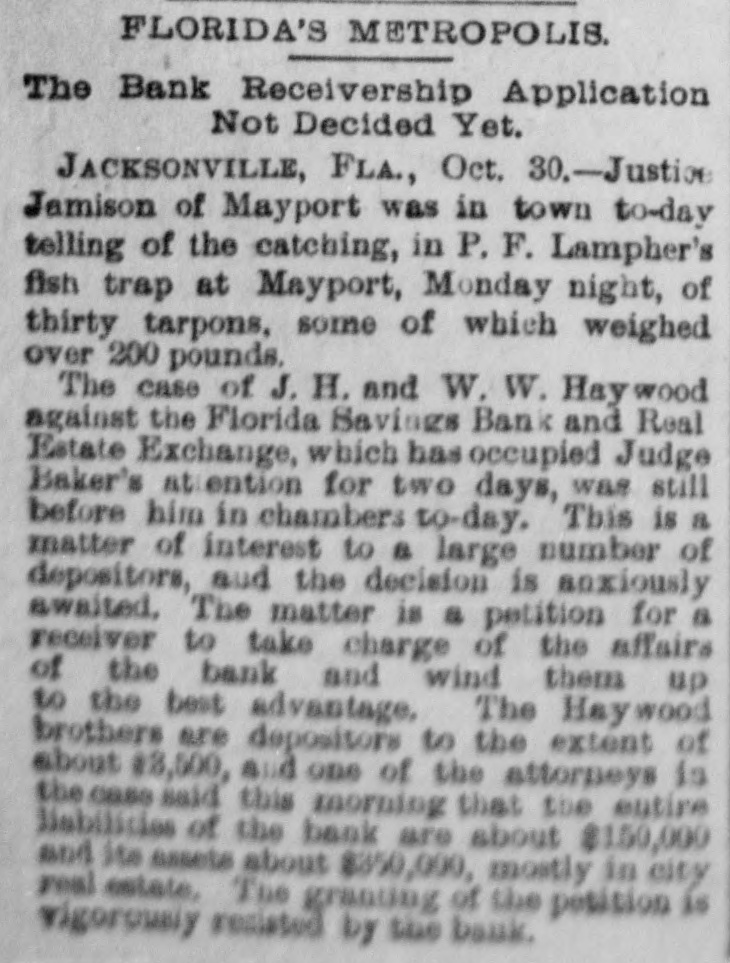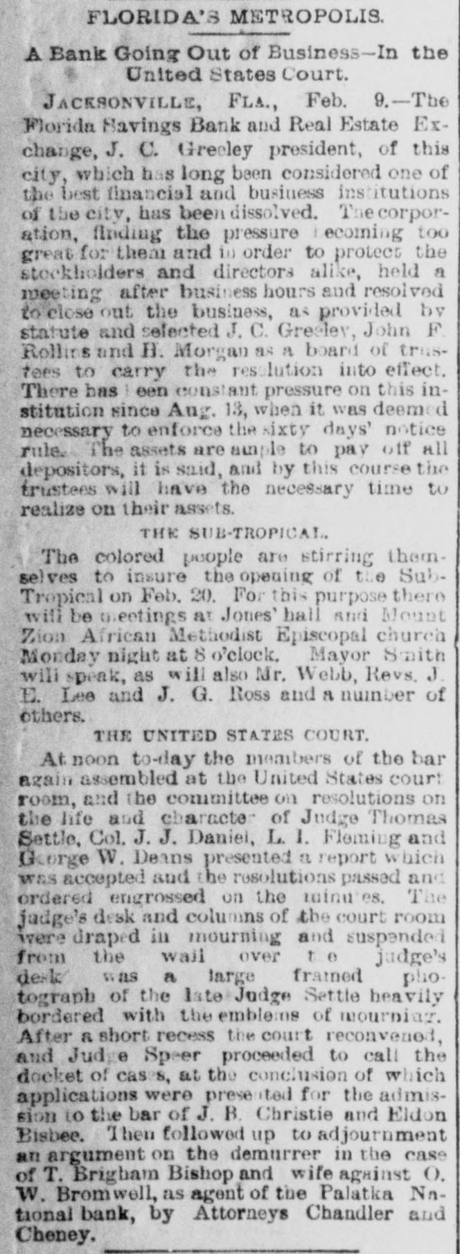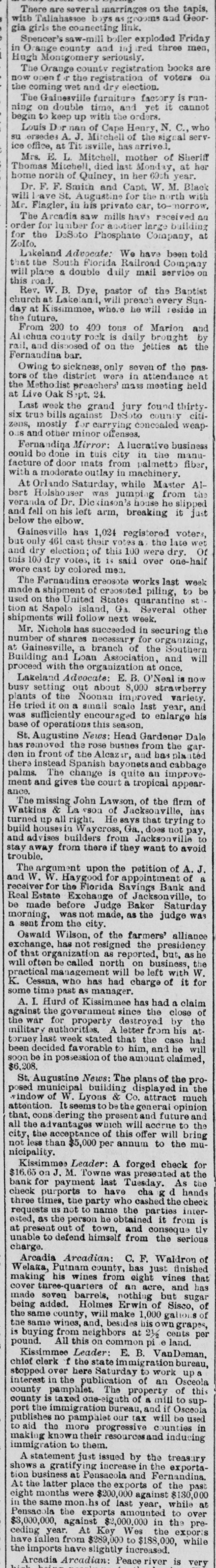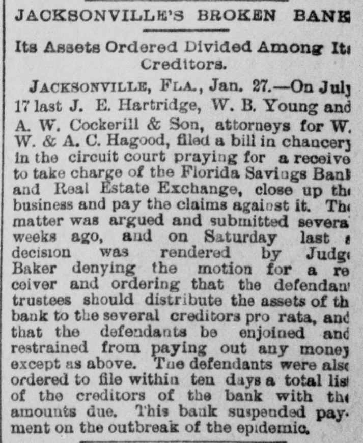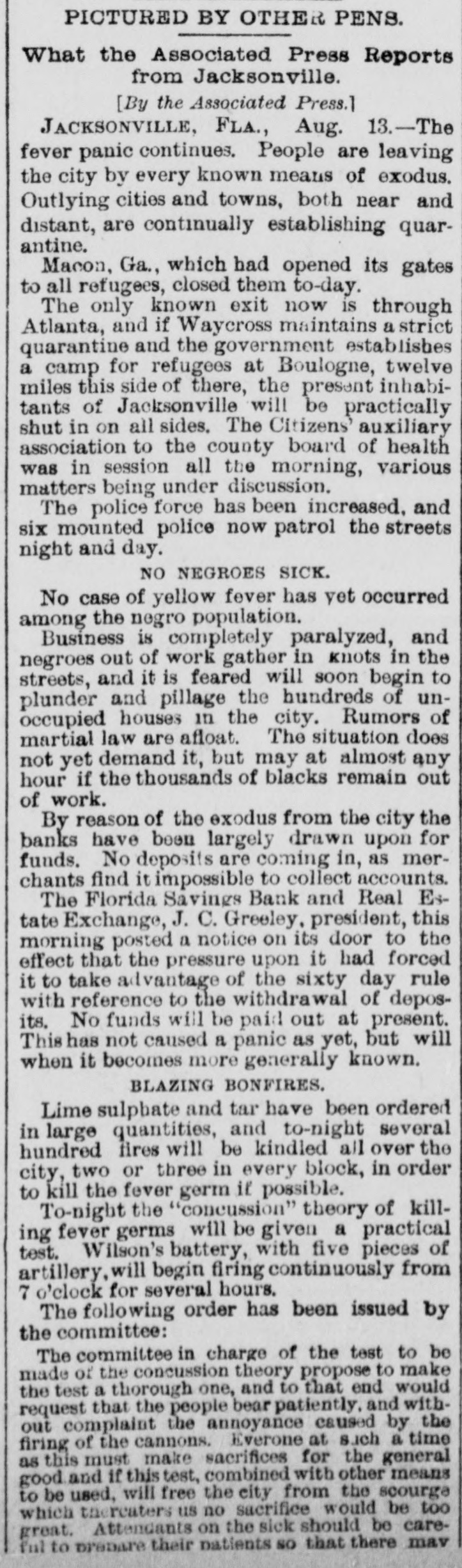 Fleeing from the Fever. PANIC-STRICKEN PEOPLE LEAVING JACKSONVILLE. The fever panic at Jacksonville, Fla., continues. People are leaving the city by every known means or exodus. The outlying cities and towns both near and distant are establishing quarantine against the fugitives. The only known exit is now through Atlanta, and If Wayeross maintains a strict quarantine and the Government establishes a camp for refugees at Boulogne, the pres. ent inhabitants of Jacksonville will be practically shut in on all sides. The police force has been increased, and six mounted police now patrol the streets night and day. Business is completely paralyzed, and colored people out of work gather in knots in streets, and it is feared will SOOL begin to plunder the hundreds of unoccupied houses in the city. Rumors of martial law are afloat. By reason of the exodus from the city the banks have been largely drawn upon for funds. No deposits are coming in, as the merchants find it impossible to collect accounts. The Florida Savings Bank and Real Estate Exchange, J. C. Greeley, president, yesterday posted a notice on the door to the effect that the pressure upon it had forced it to take advantage of the sixty-day rule with reference to the withdrawal of deposits. No funds will be paid out at present. This has not caused a panic as yet, but will, it is thought. Line, sulphur, and tar have been ordered in large quantities, and last night several hundred fires were burning all over the city, two or three in every block, in order to kill the fever germs, If possible. Last night also the "concussion" theory of killing fever germs was being given a practical test. Wilson's battery, with tive pieces of artillery, is firing continuously. This order has been issued by the committee: "The committee in charge of the test 10 be made of the concussion theory propose to make the test a thorough one, and to that end would request that people bear patiently and without complaint the annoyance caused by the firing of cannon. Every one at such & time as this must make sacrifices for the general good, and If this test, combined with other means to be used, will free the city from the scourge which threatens us, no sacrifice would be too great. Attendants or the sick should be careful to prepare their patients so that there may be no unnecessary shock from the noise, and urge them to submit patiently. The hours will be from 6 to a. m. and from 8 to p. m., perhaps longer." Nearly every hotel, boarding-house, and restaurant has been closed. Hundreds or stores are closed, and the proprietors have fied. All others close at 5 p. m. and open at 9 a. m., in order to avoid contact with the night air. All malis are fumigated by order of the Post-Office Department. The Western Union Telegraph Office is seriously embarrassed, only about one-third of the operators remain. The press reports for the TimesUnion could not be taken from the wires Monday night. The men could not work. There is great difficulty in transmiting specials. Score upon score are recurred to the newspaper correspondents "not transmitted." The situation at 7 p. m. last evening was as for lows: Only two new cases of yellow fever are reported in the city as occurring in the past twentyfour hours-B. F. Dillon, superintendent of the Western Union Telegraph Company, and William Sheppard, residingo Church street. Dr. Mitchell, president of the board of health, does not think Mr. Gelder died of yellow fever. No other deaths are reported. Deaths to-day, 1; recovered, 1; under treatment, 19; whole number or cases so far, 25; total deaths, s