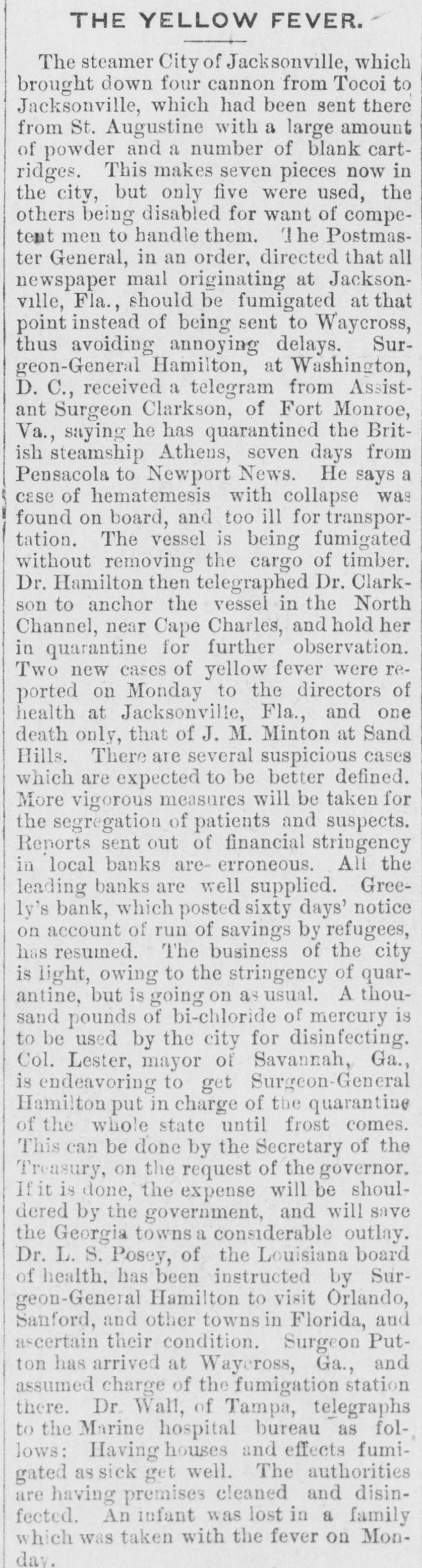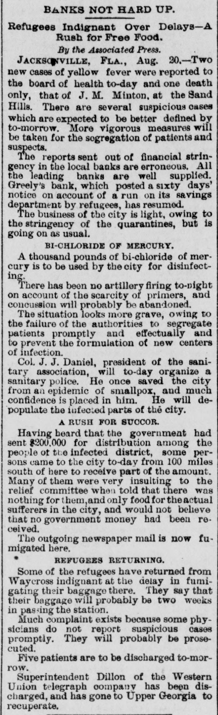 BANKS NOT HARD UP. Refugees Indignant Over Delays-A Rush for Free Food. By the Associated Press. JACKSONVILLE, FLA., Aug. 20.-Two new cases of yellow fever were reported to the board of health to-day and one death only, that of J. M. Minton. at the Sand Hills. There are several suspicious cases which are expected to be better defined by to-morrow. More vigorous measures will be taken for the sogregation of patients and suspects. The reports sent out of financial stringency in the local banks are erroneous. All the leading banks are well supplied. Greely's bank, which posted a sixty days' notice on account of a run on its savings department by refugees, has resumed. The business of the city is light, owing to the stringency of the quarantines, but is going on as usual. BI-CHLORIDE OF MERCURY. A thousand pounds of bi-chloride of mercury is to be used by the city for disinfecting. There has been no artillery firing to-night on account of the scarcity of primers, and concussion will probably be abandoned. The situation looks more grave, owing to the failure of the authorities to segregate patients promptly and effectually and to prevent the formulation of new centers of infection. Col. J. J. Daniel, president of the sanitary association, will to-day organize a sanitary police. He once saved the city from an epidemic of smallpox, and much confidence is placed in him. He will depopulate the infected parts of the city. A RUSH FOR SUCCOR. Having beard that the government had sent $200,000 for distribution among the people of the infected district, some persons came to the city to-day from 100 miles south of here to receive part of the amount. Many of them were very insulting to the relief committee when told that there was nothing for them, and only food for the actual sufferers in the city, and would not believe that no government money had been received. The outgoing newspaper mail is now fumigated here. REFUGEES RETURNING. Some of the refugees have returned from Waycross indignant at the delay in fumigating their baggage there. They say that their baggage will probably be two weeks in passing the station. Much complaint exists because some physicians do not report suspicious cases promptly. They will probably be prosecuted. Five patients are to be discharged to-morrow. Superintendent Dillon of the Western Union telegraph company has been discharged, and has gone to Upper Georgia to recuperate.