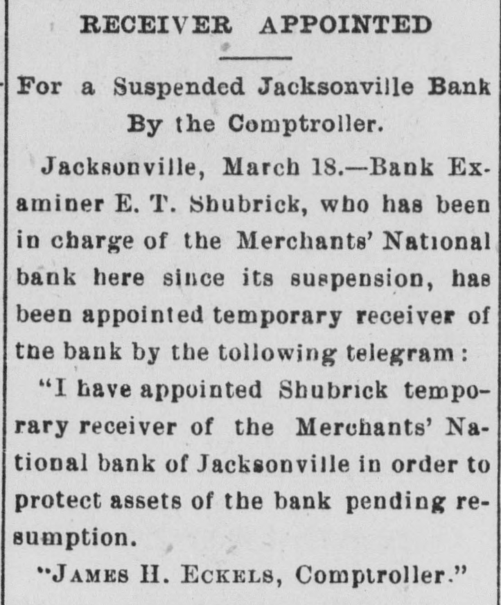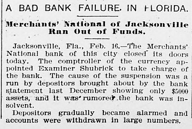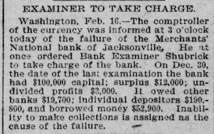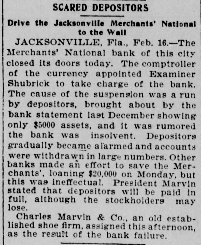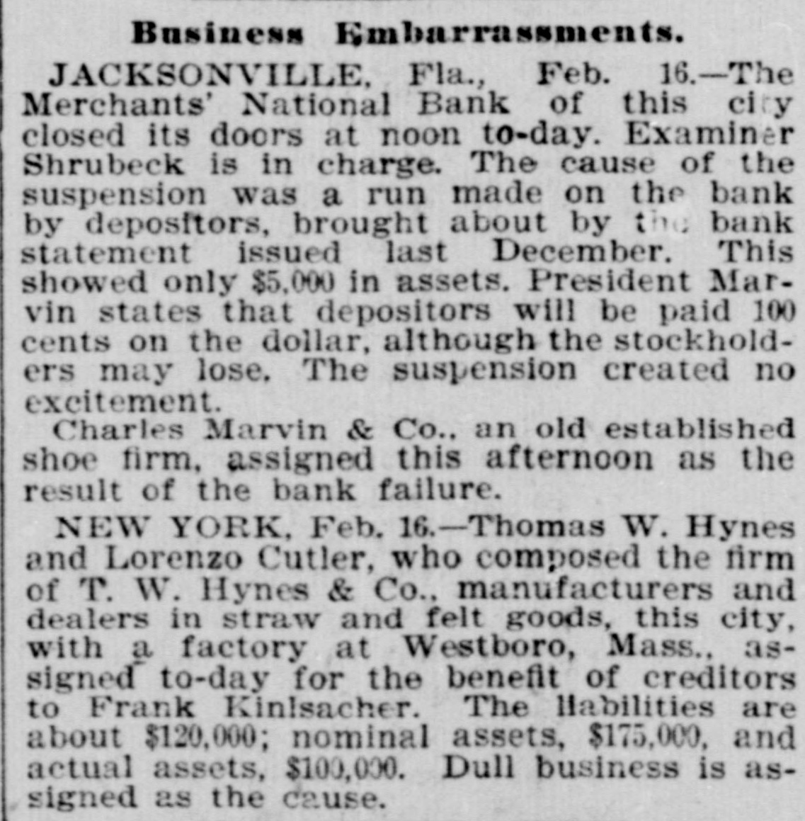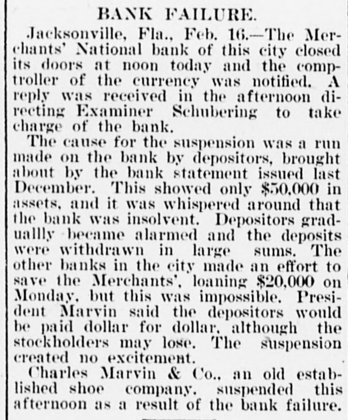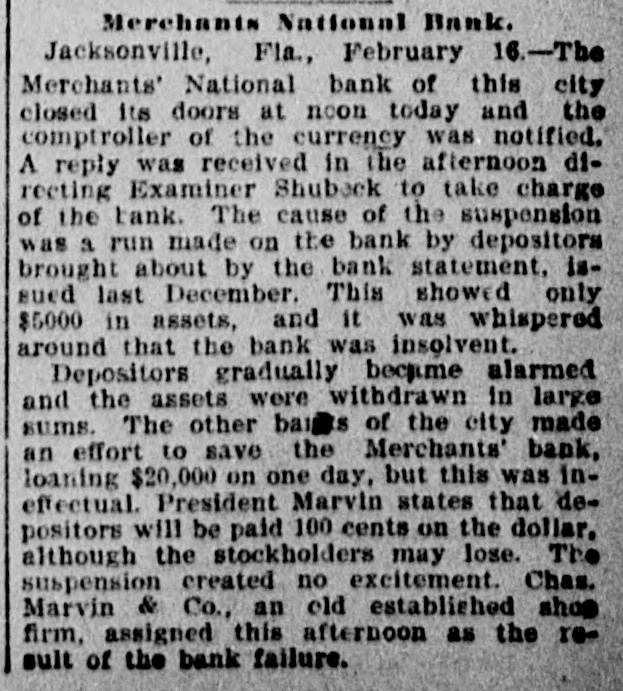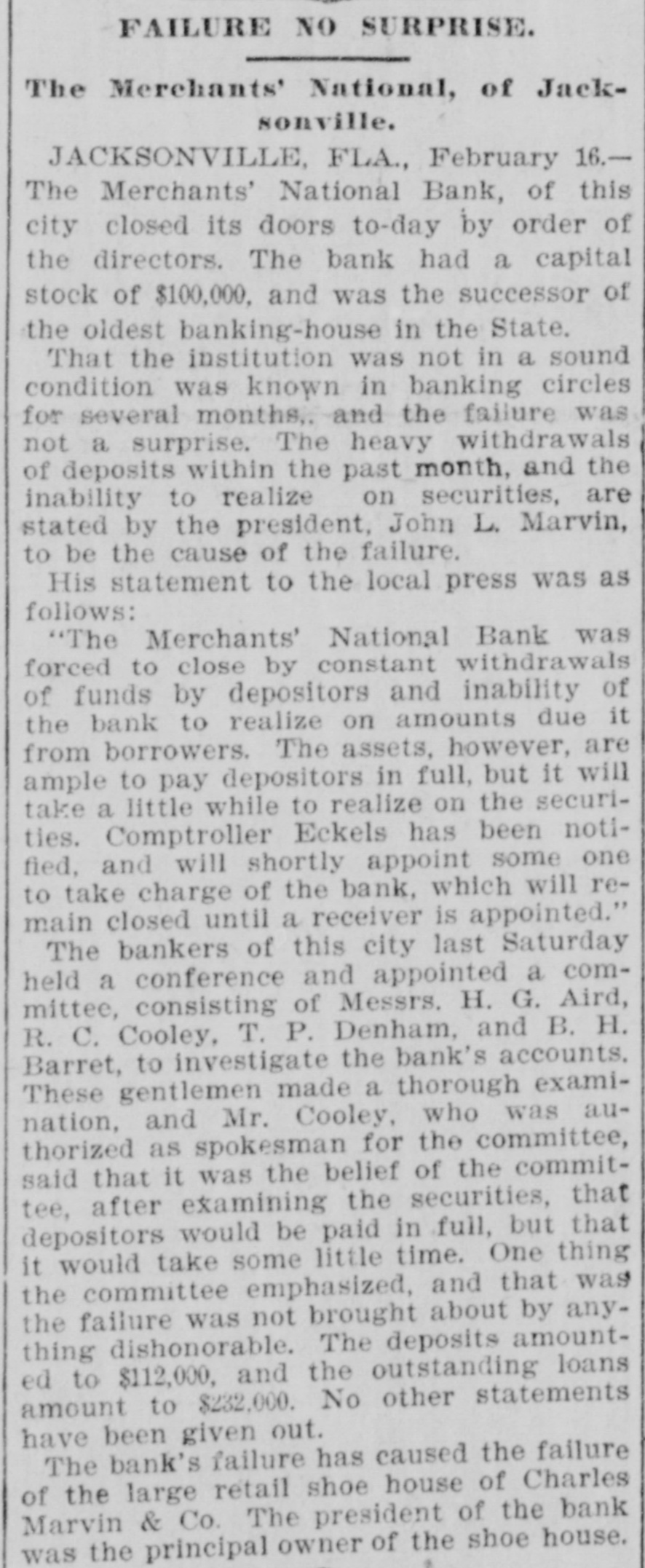 FAILURE NO SURPRISE. The Merchants' National, of Jacksonville. JACKSONVILLE, FLA., February 16.The Merchants' National Bank, of this city closed its doors to-day by order of the directors. The bank had a capital stock of $100,000, and was the successor of the oldest banking-house in the State. That the institution was not in a sound condition was known in banking circles for several months, and the failure was not a surprise. The heavy withdrawals of deposits within the past month, and the inability to realize on securities, are stated by the president, John L. Marvin, to be the cause of the failure. His statement to the local press was as follows: "The Merchants' National Bank was forced to close by constant withdrawals of funds by depositors and inability of the bank to realize on amounts due it from borrowers. The assets, however, are ample to pay depositors in full, but it will take a little while to realize on the securities. Comptroller Eckels has been notified, and will shortly appoint some one to take charge of the bank, which will remain closed until a receiver is appointed." The bankers of this city last Saturday held a conference and appointed a committee, consisting of Messrs. H. G. Aird, R. C. Cooley, T. P. Denham, and B. H. Barret, to investigate the bank's accounts. These gentlemen made a thorough examination, and Mr. Cooley, who was authorized as spokesman for the committee, said that it was the belief of the committee, after examining the securities, that depositors would be paid in full, but that it would take some little time. One thing the committee emphasized, and that was the failure was not brought about by anything dishonorable. The deposits amounted to $112,000, and the outstanding loans amount to $232,000. No other statements have been given out. The bank's failure has caused the failure of the large retail shoe house of Charles Marvin & Co. The president of the bank was the principal owner of the shoe house.