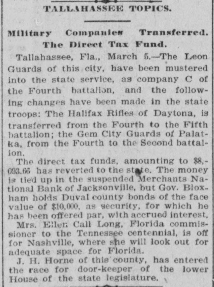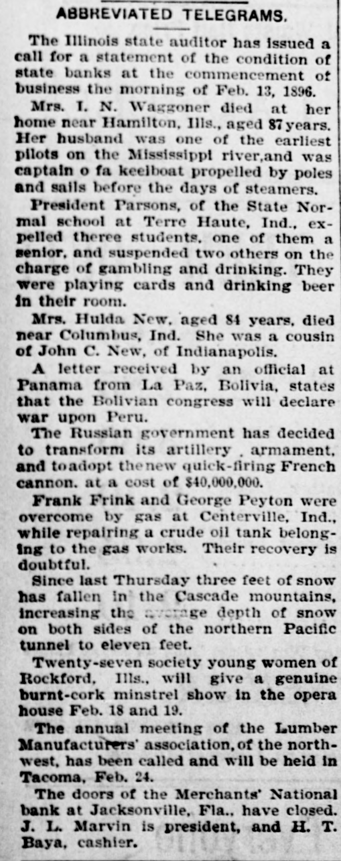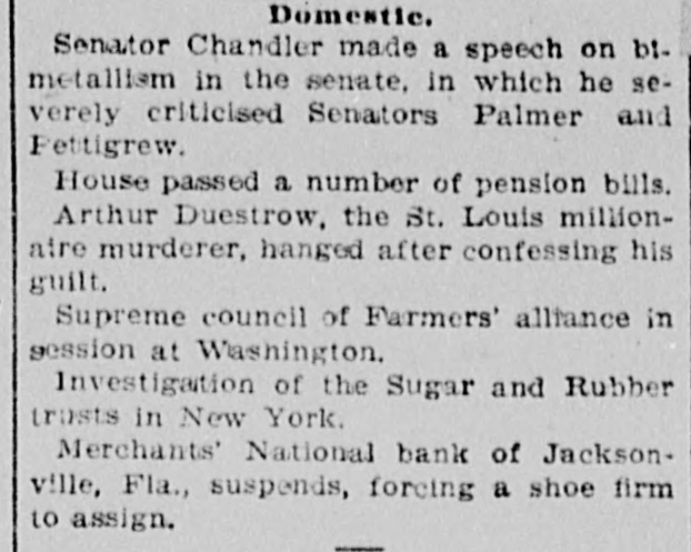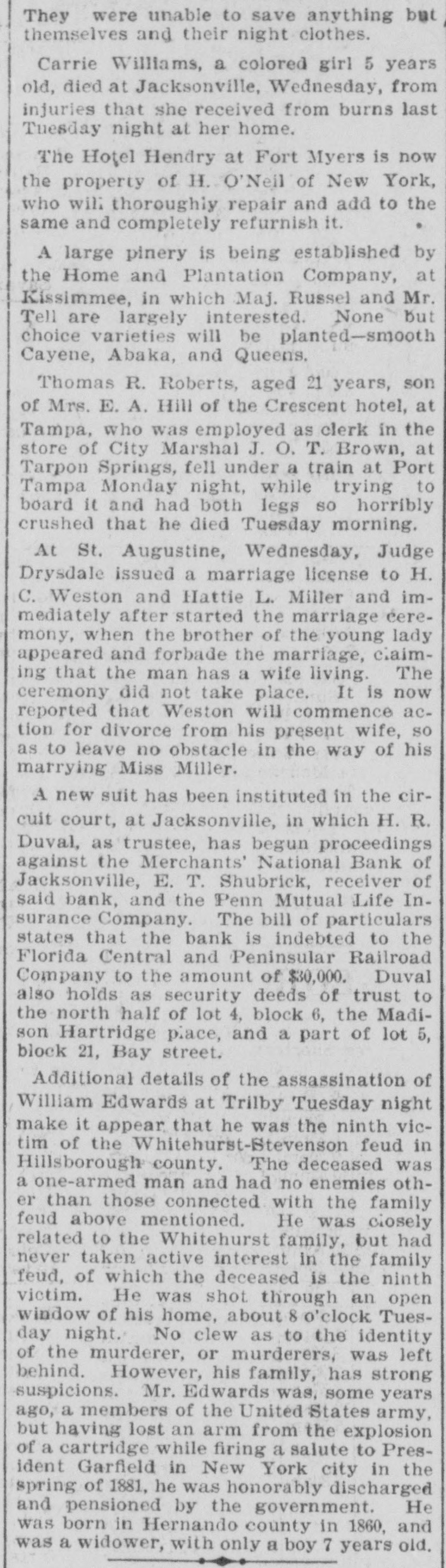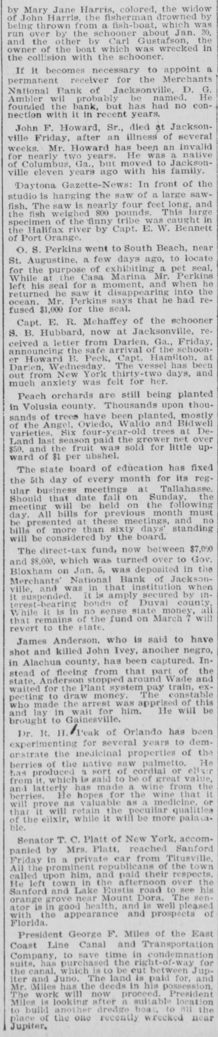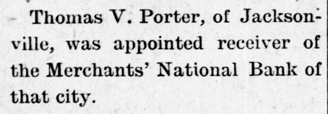 FAILURE NO SURPRISE. The Merchants' National, of Jacksonville. JACKSONVILLE, FLA., February 16.The Merchants' National Bank, of this city closed its doors to-day by order of the directors. The bank had a capital stock of $100,000, and was the successor of the oldest banking-house in the State. That the institution was not in a sound condition was known in banking circles for several months, and the failure was not a surprise. The heavy withdrawals of deposits within the past month, and the inability to realize on securities, are stated by the president, John L. Marvin, to be the cause of the failure. His statement to the local press was as follows: "The Merchants' National Bank was forced to close by constant withdrawals of funds by depositors and inability of the bank to realize on amounts due it from borrowers. The assets, however, are ample to pay depositors in full, but it will take a little while to realize on the securities. Comptroller Eckels has been notified, and will shortly appoint some one to take charge of the bank, which will remain closed until a receiver is appointed." The bankers of this city last Saturday held a conference and appointed a committee, consisting of Messrs. H. G. Aird, R. C. Cooley, T. P. Denham, and B. H. Barret, to investigate the bank's accounts. These gentlemen made a thorough examination, and Mr. Cooley, who was authorized as spokesman for the committee, said that it was the belief of the committee, after examining the securities, that depositors would be paid in full, but that it would take some little time. One thing the committee emphasized, and that was the failure was not brought about by anything dishonorable. The deposits amounted to $112,000, and the outstanding loans amount to $232,000. No other statements have been given out. The bank's failure has caused the failure of the large retail shoe house of Charles Marvin & Co. The president of the bank was the principal owner of the shoe house.