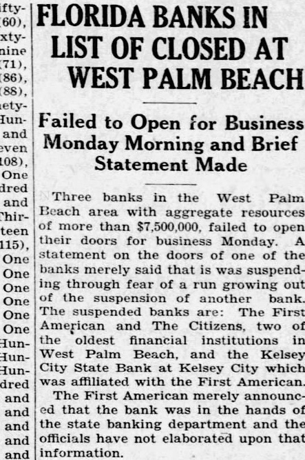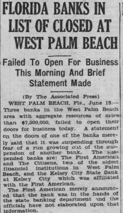 THREE BANKS FAIL TO OPEN IN FLORIDA First American Institution at West Palm Beach Gives No Statement. By the Associated Press. WEST PALM BEACH. Fla., June 19.-Two banks in West Palm Beach and one nearby, with aggregate resources of more than $7,500,000, failed to open yesterday and the statement was made on behalf of one of them that it was closed to avoid a possible run growing out of the suspension of one of the others. The banks closed are the First American Bank. the Citizens Bank, two of the oldest financial institutions in West Palm Beach, and the Kelsey City State Bank at Kelsey City near here, which is affiliated with the First American. Officials of the First American could not be reached for a statement. The bank is in the hands of the State banking department. The closing of the Citizens Bank, It was said, was caused by the First American's closing. The First American had been reopened and has been operating for several months following a temporary closing two years ago. The suspensions today did not affect the Central Farmers' Trust Co., the only other bank in West Palm Beach, or the First National. Palm Beach's only financial institution.