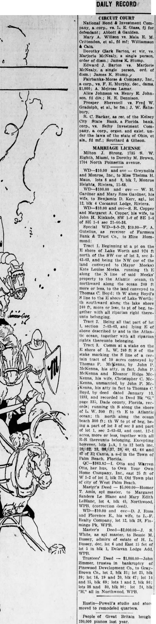 DAILY RECORD CIRCUIT COURT National Bond & Investment Company, corp., VS. L. E. Glass, fj for defendant; Abbott & Gaulden. Mary A. Willson vs. Mala E. M. Crittenden, et al., fd mf; Williamson Dorothy Clark Barton, et vir, VS Marjorie McNealy. single person, order of dism.: James K. Stump. Edward J. Barton vs. Marjorie McNealy. single person, ord. of dism.; James K. Stump. Fairbanks Morse Company, Inc., a corp., vs. F. E. Murphy, dec., dams. $1,000; A. Melrose Lamar Alice Johnson vs. Henry E. Johnson. fd div.; H. E. Dennison. Prosper Shevenell VS. Fred W. Gradolph, et al., be fm.: J. W. Salisbury. R. C. Barker, as rec. of the Kelsey City State Bank, Florida bank corp., VS. Selby Investment Company, corp., organ. and exist. under the laws of the state of Ohio, et als., fd mf.: Southard Gibson. MARRIAGE LICENSE Milton Strong. 1735 S. W. Eighth, Miami, to Dorothy M. Brown, 1704 North Poinsettia avenue. WD-$10.00 and ove Greynolds and Monroe, Inc., to Miss Thelma H. Maus, lots and 9. blk 7, Monroe Heights, Riviera, 11-68. WD-$100.00 and ove W. H. Gardner and Mary Rose Gardner, his wife, to Benjamin D. Kerr. sgl., lot 12. blk Cocoanut Lodge, Riviera. WD-$10.00 and ove-S. R. Copper and Margaret A. Copper, his wife, to John H. Kinkade, SW 1-4 of SE 1-4 of SE 1-4 sec 21-41-36. Special WD-8-9-29, $10.00-F. A. Gutelius, as receiver of Farmers Bank & Trust Co., to Elise Hommond: Tract 1. Beginning at pt on the E shore of Lake Worth and 924 ft north of the SW cor of lot 3, sec 343-43, and being the NW cor of the land conveyed to (Mayor Meeks) Kate Louise Meeks. running th E along the N line of said Meeks property to the Atlantic ocean, th northward along the ocean 240 ft more or less, the land conveyed to Thomas C. Boyd: th W along Boyd's S line to the shore of Lake Worth: th southward along the lake shore 240 ft. more or less, to pt of beg. together with all riparian right thereunto belonging Tract Being all that part of lot 1, section 2-43-43, and lying E of above described tr and to the Atlantic ocean, together with all riparian rights thereunto belonging. Tract 3. Comm at stake on the E shore of L. W. 240 ft S of the stake marking the S line of certain tract of 10 acres conveyed by Thomas P. McKenna, by John P. McKenna, his atty. in fact, John P. McKenna and Eleanor Ridge McKenna, his wife, Christopher C. McKenna, unmarried, by John P. Mc. Kenna, his atty in fact to Thomas C. Boyd, by deed dated January 13, 1893, and recorded in Deed Bk "G," page 335, Dade county, Florida, records: running th S along the shore of L. W. 300 ft; th E to Atlantic ocean; th north along the ocean beach 300 ft; th W to pt of beg. being part of lot of sec and part of lot sec 2-43-43, and cont. 12-1 acres, more or less, together with all R-R thereunto belonging. Excepting however, lots 1-A, to 12 both inc, 17 of E1 Canto, s-d in the Town of Palm Beach. Florida. QC-$363.82-1. Otto and Warren Otto, her hus, to Own Your Own Home Company, Inc., east 25 ft of W 1-2 of lot 2, blk 23, Old Town plat of city of West Palm Beach. Master's Deed - $5,000.00-Homer T. Amis, spl master. to Margaret Sanders Le Blanc and Mary Edith LeBlane, lot 4, blk 45, Northwood, WPB. (correction deed). WD-$10.00 and ove-D. J. Ross and Florence E., his wife, to L.-F. Realty Company, lot 12, blk 28, Flamingo Pk, WPB. Master's Deed-$2,000.00-J. S. White, as spl master, to Bessie M. Bussey, admirx of estate of H. Bussey, dec, lot and East 15 fet of lot in blk 1, Delavan Lodge Add, WPB. Trustees' Deed $1,000.00-John Zimmer. trustee in bankruptcy of Pinewood Development Co., to GrayBrown Co., lot 3, blk 31; lot 25, blk 39: lot 18, 19 and 20. blk 67: lot 14 and 15, blk 69: lots and 2, blk 86: lots 38 and 30, blk 90: lot 24, blk "H," all in Northwood, WPB. Eustis-Powell's studio and store moved to remodeled quarters. People of Great Britain bought 100,000 pianos last year.