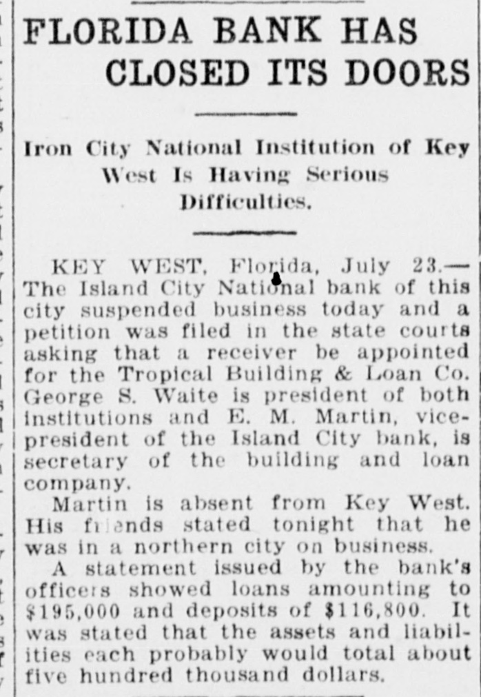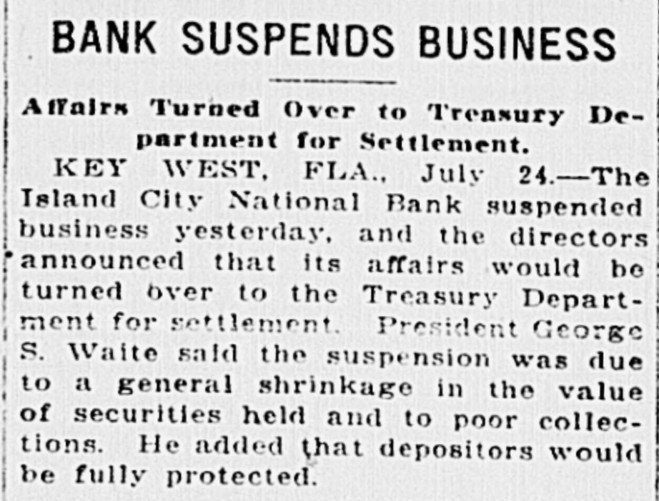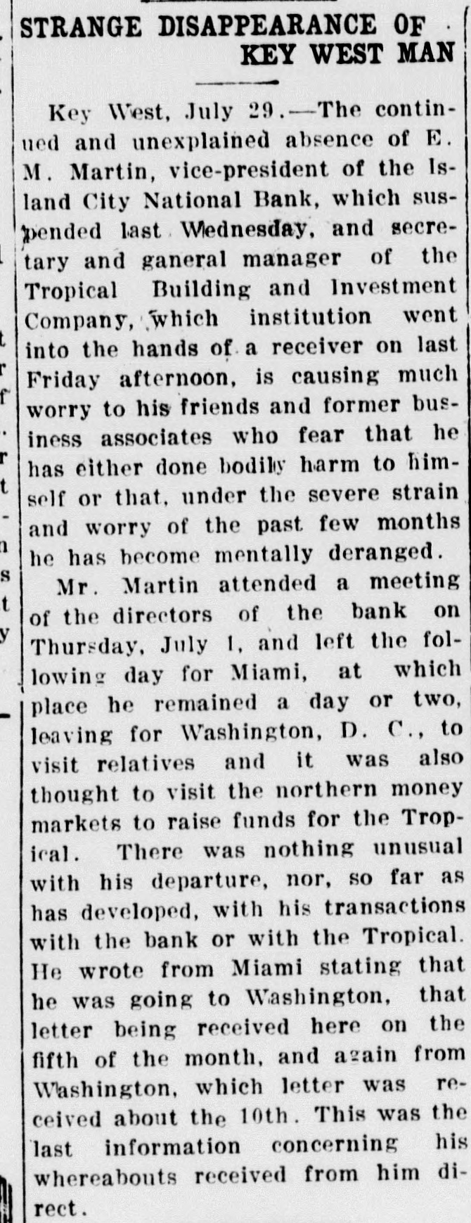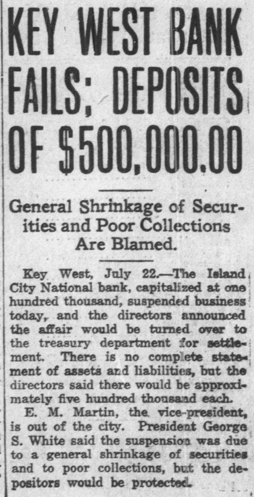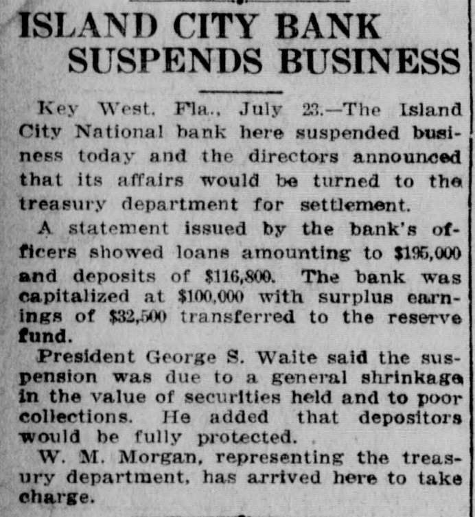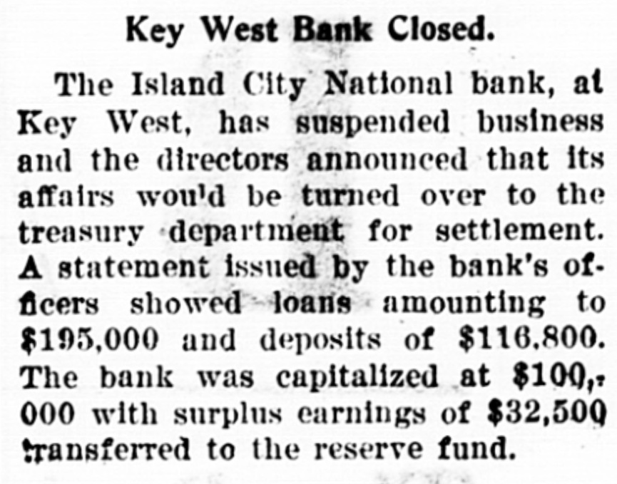 U. S. Treasury Holding Unclaimed Monies Of Old Island City Bank Sixteen Hundred Dollars Selection Made Of Guard In Dividends Belongs To Heirs Of DeposiMembers For Ceremonies tors By PAUL MAY On Sunday At Matecumbe (Special Washington Correspondent of The Citizen) WASHINGTON, D. C., Nov. 8. W. of Roberts, Kirk Albury, Louis RichHarris, Curry Captain ardson, George Saunders, Jack Company "E", Florida National -The United States Treasury, Saunders, Manuel Cervantes, Guard, today announced the comstill is trying to get rid of $1,Charles Martinez, Neal Mojica, pany members who will go next Julian Lucignani, Joe Henriquez, Sunday to Matecumbe to take 689.04 that belongs to the heirs of Harry Bravo. part in the Keys Memorial Dedi710 Key West depositors in the The detail will be in command cation. of Lieutenant Wm. E. P. RobThose selected to represent the closed Island City National Bank erts and Major Wm. V. Albury, company are: Joseph W. Baker, of Key West. in command of the Second BatJack Porter, Oscar E. Ward, Lutalion of the 265th Regiment cio Barrosa, Arnold Byre, Joseph The Treasury did not make pubC. A. C., will accompany the deSoldano, Mathew Zacal, Joseph lic the names of the depositors, Cates, George del Pino, Everett tail. but explained they or their heirs have that amount coming to them Interest In Election Now in unclaimed dividends from the bank's assets. Centers Mainly On Mayor, The bank failed and its receivership was terminated in 1923. Chief And Police Captain At that time the receivers turned offices for which they are conHighly interesting from several in to the Treasury such funds as tending: angles will be the election of city they were unable to find claimants For Mayor: Willard M. Albury officials to be held in Key West for, and the Government has been and Frank Delaney. tomorrow with opposition for For City Clerk: Wallace Pinholding the $1,689.04 ever since. every office except that of city der. What's more, officials say, it clerk, city treasurer and tax colFor Chief of Police: Ivan Ellector-assessor. looks as though the Treasury will wood and Everett R. Rivas. hold the ottes forever: It 'While there are 21 candidates For Captain Night Police: Alberto Camero, Vernie Griffin, spent, they said, and rests with for the seven seats on the city Robert J. Lewis, Bienvenido $717,591 of such funds from other council, interest appears to be Perez, Thomas F. Russell (Bustclosed banks in trusts in Washingmore greatly centered on the er). election of mayor, chief of poton banks, drawing no interest. For Tax Collector-Assessor: "Every once in a while some lice and captain of night police, Samuel B. Pinder. one goes through Grandpa's old for which there are two, two and For Police Justice: Thomas S. papers and find documents to five candidates for the respecCaro and Abelardo Lopez, Jr. make a claim for some of these tive offices. For Councilmen: Benj. N. old funds and we get rid of them," Speculation is rampant, naturAdams, Earl Adams (Jewfish), a spokesman for the controller of ally, on the probable winners in W. P. Archer, E. M. Carbonell currency's office said, adding: each event, but a survey of the (Toots), John Carbonell, Jr., Wm. "Claims are very infrequent in centers of speculation today, T. Doughtry, Jr., William A. such old cases as the Key West brought to light the fact that Freeman, Roy Fulford, Earl Inbank, and we really haven't much the race for chief, captain and graham (Rinkley Bill), Charles S. hope of ever finding the owners mayor, are the most discussed, Lowe, Roy L. McKillip, Wm. H. of this cash." and have thus caused more specMonsalvatge, P. Adrian O'Swee-