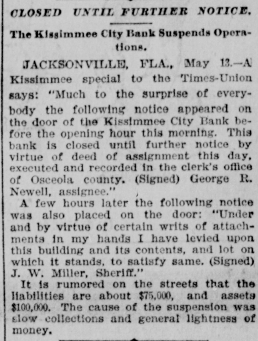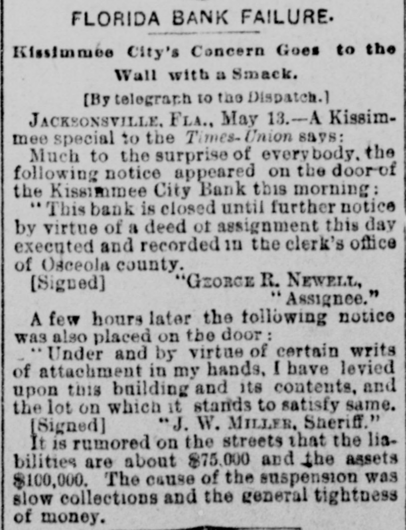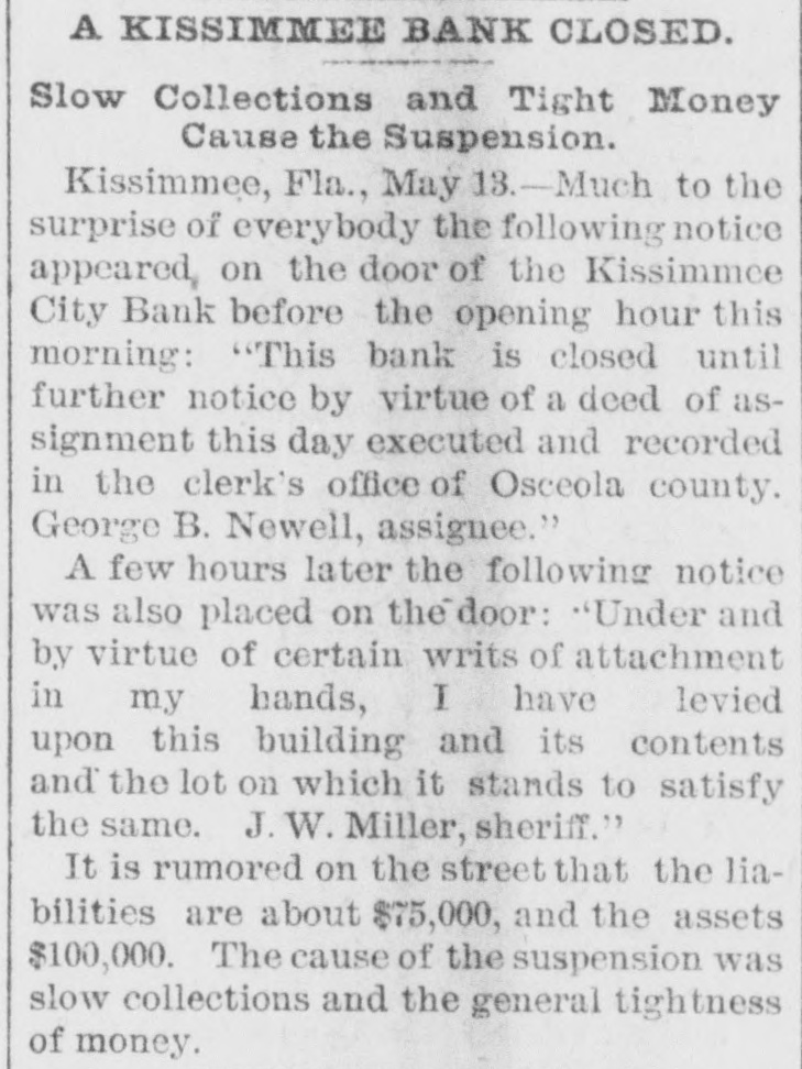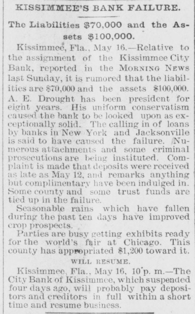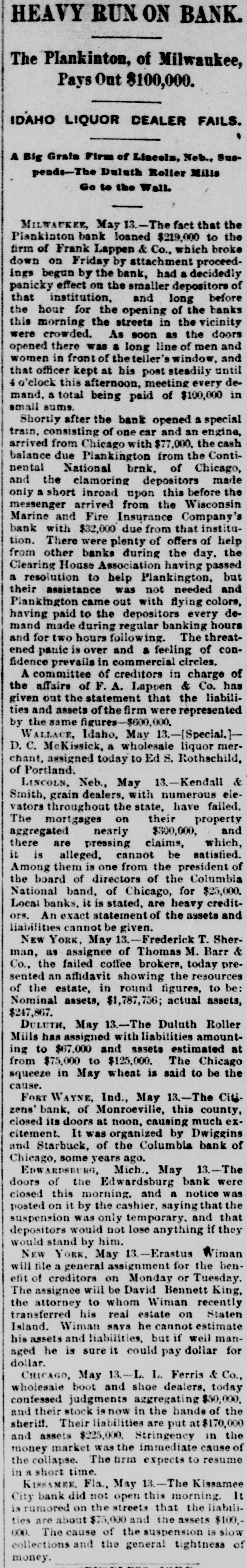 HEAVY RUN ON BANK. The Plankinton, of Milwaukee, Pays Out $100,000. IDAHO LIQUOR DEALER FAILS. A Big Grain Firm of Lincoln, Neb., Suspends-The Duluth Roller Mills Go to the Wall. MILWAUKER May 13.-The fact that the bank loaned $219,000 to the & Co., Friday by firm Plankinton of Frank Lappen attachment which proceed- broke the bank, had a effect on the smaller of down ings panicky begun on by depositors decidedly before that institution, and long the hour for the opening of the banks this morning the streets in the vicinity were crowded. As soon as the doors opened there was s long line of men and women in front of the teller's window, and that officer kept at his post steadily until o'clock this afternoon, meeting every demand. a total being paid of $100,000 in small same. Shortly after the bank opened a special train, consisting of one car and an engine, arrived from Chicago with $77,000. the cash balance due Plankington from the Continental National brnk. of Chicago, and the clamoring depositors made only a short inroad upon this before the messenger arrived from the Wisconsin Marine and Fire Insurance Company's bank with $32,000 due from that institution. There were plenty of offers of help from other banks during the day. the Clearing House Association having passed a resolution to help Plankington, but their assistance was not needed and Plankington came out with flying colors, having paid to the depositors every demand made during regular banking hours and for two hours following. The threatened panic is over and a feeling of confidence prevails in commercial circles. A committee of creditors in charge of the affairs of F. A. Lappen & Co. has given out the statement that the liabilities and assets of the firm were represented by the same figures-$600,000. WALLACE, Idaho, May 13.-[Special.]D. C. McKissick, a wholesale liquor chant, assigned today to Ed S. Rothschild, of Portland. LINCOLN. Neb., May 13.-Kendall & dealers, with numerous elethe state, on The Smith, vators mortgages throughout grain their have property failed. and nearly $300,000, pressing cannot aggregated it there is are alleged. claims, be satisfied. which, them is one from the of of directors of the the Among board president for Columbia $25,000. National band, of Chicago, Local banks. it is stated, are heavy creditors. An exact statement of the assets and liabilities cannot be given. NEW YORK, May -Frederick T. Sherassignee of Thomas M. Barr & failed coffee preaffidavit showing resources sented man, Co., the as an brokers, the today to be: of the estate, in round figures, Nominal assets, $1,787,756; actual assets, $247,867. 13.-The Duluth Roller Mills DULUTH, has assigned May with liabilities estimated amounting to $67,000 and assets at from $75,000 to $125,000. The Chicago squeeze in May wheat is said to be the cause. FORT WAYNE, Ind., May 13.-The Citizens' bank, of Monroeville, this county, doors at noon, causing exIt was organized citement. closed its Columbia by Dwiggins much bank and Starbuck, of the of Chicago, some years ago. EDWARDSBURG, Mich., May 13.-The the Edwardsburg bank were this a was on it by the cashier. doors closed posted of morning. and saying th notice was only temporary. would not lose depositors suspension anything and if they that would stand by him. 3.--Erastus will a assignment NEW tite YORK. general May for the Wiman benetit on Monday or Tuesday. The will be David of assignee creditors Wiman Bennett recently King, the to whom his real estate on SAVS he cannot transferred Island. attorney Wiman if well estimate Staten his assets and liabilities, but managed he is sure it could pay dollar for dollar. 13.-L. L. Ferris & Co., boot and shoe wholesale CHICAGO, May dealers. $50,000, today confessed judgments aggregating and their stock is now in the hands of the sheriff. Their liabilities are put at $170,000 and assets $225,000. Stringency in the money market was the immediate cause of the collapse. The firm expects to resume in short time. KIRSAMEE. Fla., May 3.-The Kissamee It City bank did not open this morning. rumored on the streets that the liabilities are about $75,000 and the assets $100, 000. The cause of the suspension is slow collections and the general tightness of money.