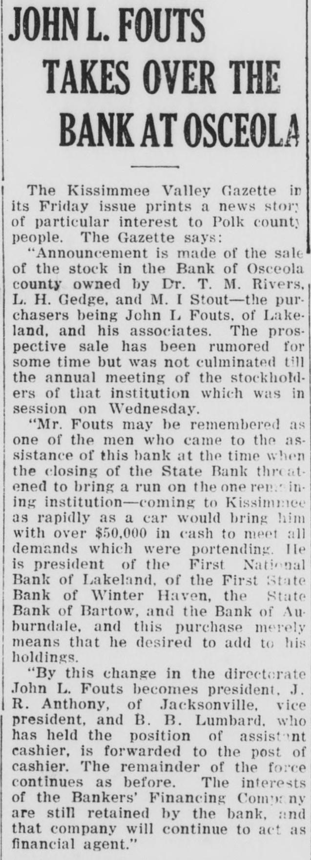 JOHN L. FOUTS TAKES OVER THE BANK AT OSCEOLA The Kissimmee Valley Gazette in its Friday issue prints a news story of particular interest to Polk county people. The Gazette says: "Announcement is made of the sale of the stock in the Bank of Osceola county owned by Dr. T. M. Rivers, L. H. Gedge, and M. I Stout-the purchasers being John L Fouts. of Lakeland, and his associates. The prospective sale has been rumored for some time but was not culminated till the annual meeting of the stockholders of that institution which was in session on Wednesday. "Mr. Fouts may be remembered as one of the men who came to the assistance of this bank at the time when the closing of the State Bank threat. ened to bring a run on the one repain ing institution-coming to Kissimmee as rapidly as a car would bring him with over $50,000 in cash to meet all demands which were portending He is president of the First National Bank of Lakeland, of the First State Bank of Winter Haven, the State Bank of Bartow, and the Bank of Auburndale, and this purchase merely means that he desired to add to his holdings. "By this change in the directorate John L. Fouts becomes president. J. R. Anthony, of Jacksonville, vice president, and B. B. Lumbard. who has held the position of assistant cashier, is forwarded to the post of cashier. The remainder of the force continues as before. The interests of the Bankers' Financing Company are still retained by the bank, and that company will continue to act as financial agent."