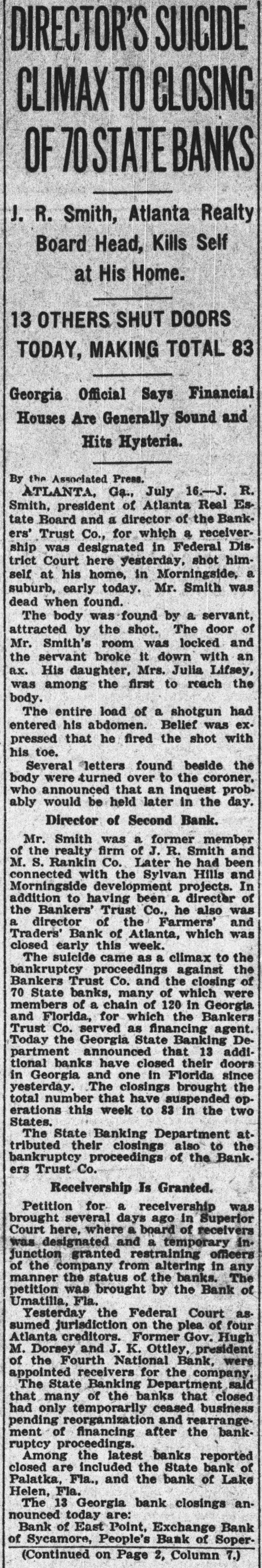 DIRECTOR'S SUICIDE CLIMAX TO CLOSING OF 70 STATE BANKS J. R. Smith, Atlanta Realty Board Head, Kills Self at His Home. 13 OTHERS SHUT DOORS TODAY, MAKING TOTAL 83 Georgia Official Says Financial and Houses Are Generally Sound Hits Hysteria. By the Associated Press. R. 16.-J. ATLANTA, Ga., Atlanta July Real Es president of of the Bank Smith, and a director receivertate Board Co., for which Federal a Disers' ship Trust was designated in shot himtrict Court here home, yesterday, in Morningside, was a suburb, self at his early today. Mr. Smith dead when found. was found by a servant, door of attracted The body by the shot. The locked and Smith's room was with an Mr. servant broke it down Julia Lifsey, was ax. the His among daughter, the first Mrs. to reach the body. entire load of a Belief shotgun was had exhis entered pressed The his that abdomen. he fired the shot with Several toe. letters found to the beside coroner. the body were turned that over an inquest prob- day. ably who announced would be held later in the Director of Second Bank. a former member and Mr. Smith firm was of J. R. Smith had been of the S. Rankin realty Co. Later Sylvan he Hills and In M. connected with development the a projects. director of Morningside to having been Co., he also was the addition Bankers' Trust the Farmers was and a director of of Atlanta, which early this a suicide came as against Traders' closed The Bank proceedings week. climax to the the of bankruptcy Co. and the which closing were State banks, many of 120 in 70 of a which the Bankers members Florida, Trust for chain financing of Bankers Georgia agent. Deand Co. served as State Banking addiToday Trust the Georgia St announced that 13 doors partment banks have closed in Florida their since tional and one brought the in Georgia The closings suspended optotal this week yesterday. number that have to 83 in the two aterations States. State Banking Department also to the ers Trust Co. bankruptcy tributed The their proceedings closings of the BankReceivership Is Granted. was Petition several for days a receivership board ago of in receivers Superior inbrought Court here, where and a a temporary officers designated restraining from was of the status of the Bank was Junction manner company the granted brought the by altering banks. in The any of assumed petition Umatilla, Yesterday jurisdiction creditors. Fla. the Federal on Former the plea Gov. Court president of Hugh four M. the company appointed Banking that of Atlanta the Dorsey Fourth receivers and J. National K. for Ottley, Department losed Bank, were said The many State of the banks ceased business pending that had only temporarily and rearrange- the bankPalatka, ruptcy ment Among of proceedings. the included latest the banks State reported of bank Lake of closed are Fla., and the bank anHelen, 13 Fla. Georgia bank closings Bank nounced The today are: Point, Exchange of Soperof (Continued Sycamore, on Page 2, Bank of East People's Bank Column 7.)