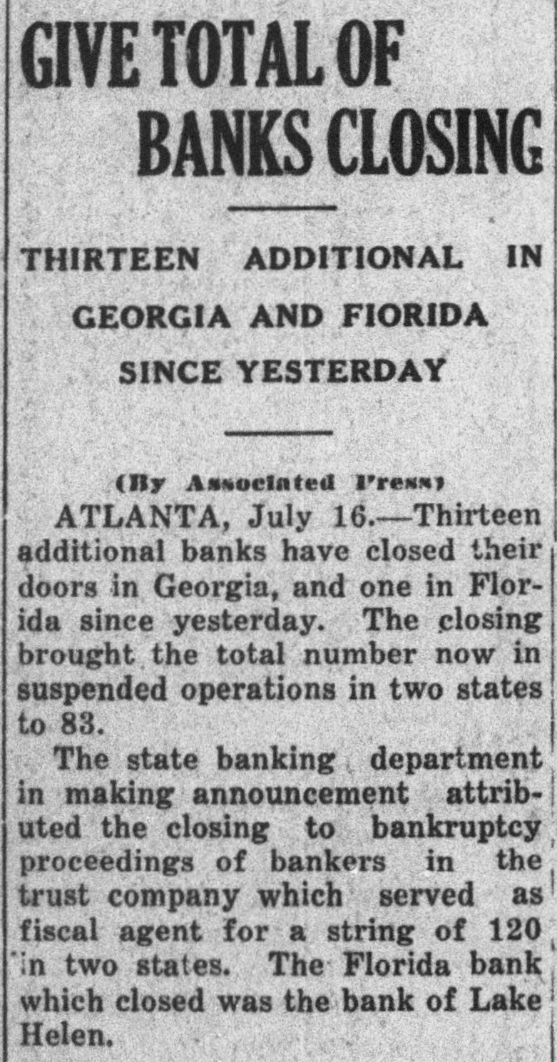 GIVE TOTAL OF BANKS CLOSING THIRTEEN ADDITIONAL IN GEORGIA AND FIORIDA SINCE YESTERDAY (By Associated Press) ATLANTA, July 16.-Thirteen additional banks have closed their doors in Georgia, and one in Florida since yesterday. The closing brought the total number now in suspended operations in two states to 83. The state banking department in making announcement attributed the closing to bankruptcy proceedings of bankers in the trust company which served as fiscal agent for a string of 120 in two states. The Florida bank which closed was the bank of Lake Helen.