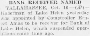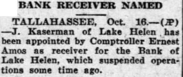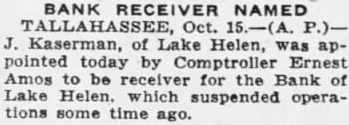 J. Kaserman ... was appointed today by Comptroller Ernest Amos be receiver for the Bank of Lake Helen, which suspended operations some time ago.