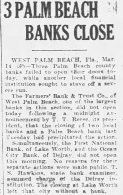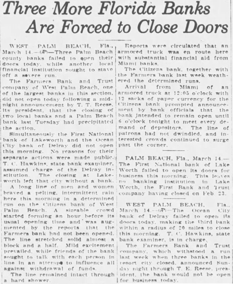 Three More Florida Banks Are Forced to Close Doors PALM Palm Beach county banks their today while another local financial to stave The Farmers Bank and Trust West Palm Beach. one of the largest banks this did open today following midnight by Its that the closing of two local banks Palm Beach bank last Tuesday had precipitated the action. the First National bank and the Ocean City bank Delray did not open this morning No reasons their separate were made public. Hawkins state bank examiner. assumed charge of the Delray stitution closing Lake worth left that without bank long line of men and women braved pelting. Intermittent rain here this morning in determined on the Citizens bank of West Palm Beach sizeable crowd started forming an hour before its usual opening time mented by the reports Farmers bank had been opened. The line stretched almost block half Mild excitement while friends of the bank sought with each person line to influence all against funds The line remained intact through hard shower Reports circulated that an armored was en route here substantial financial aid from The Citizens bank. together with the Farmers bank week weathered the determined runs. Arrival from Miami of an armored truck at o'clock with 12 of paper for the Citizens prompted announcement officials that the bank Intended to remain open until o'clock tonight to meet every de. mand depositors The line of patrons had dwindled and terested continued to surge past PALM BEACH. March The First bank of Lake Worth failed doors for business morning This banking institution Lake First Bank and Trust company having closed on Feb 23. EST PALM March Ocean bank of Delray failed open its doors making third bank radius of miles close morning T. state bank examiner. in charge The Farmers Bank and Trust three banks resort announced night through bank would not be open for business today
