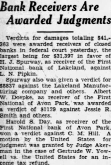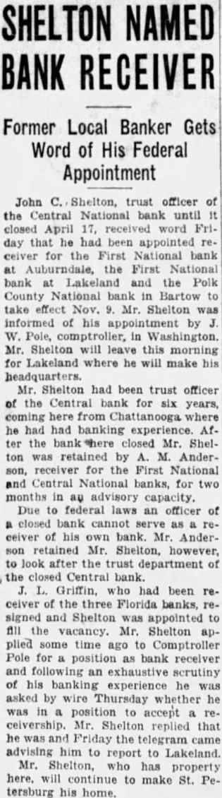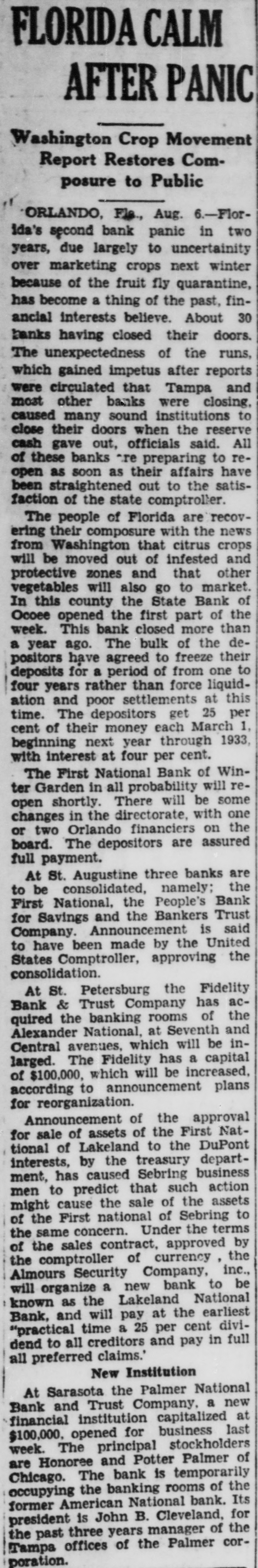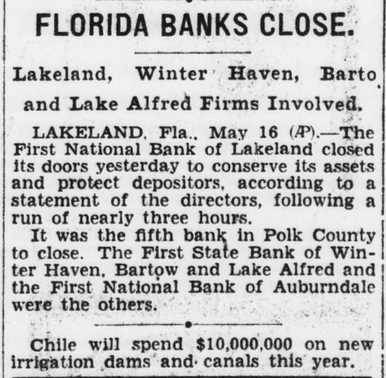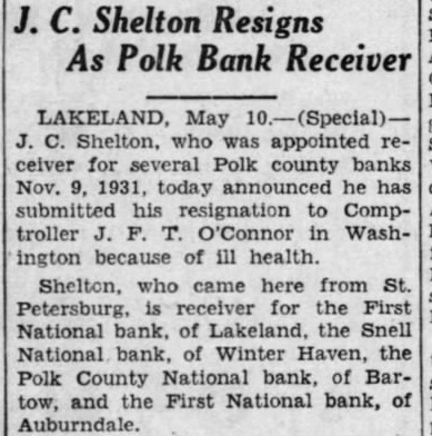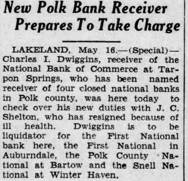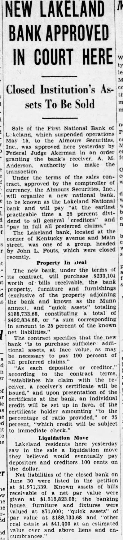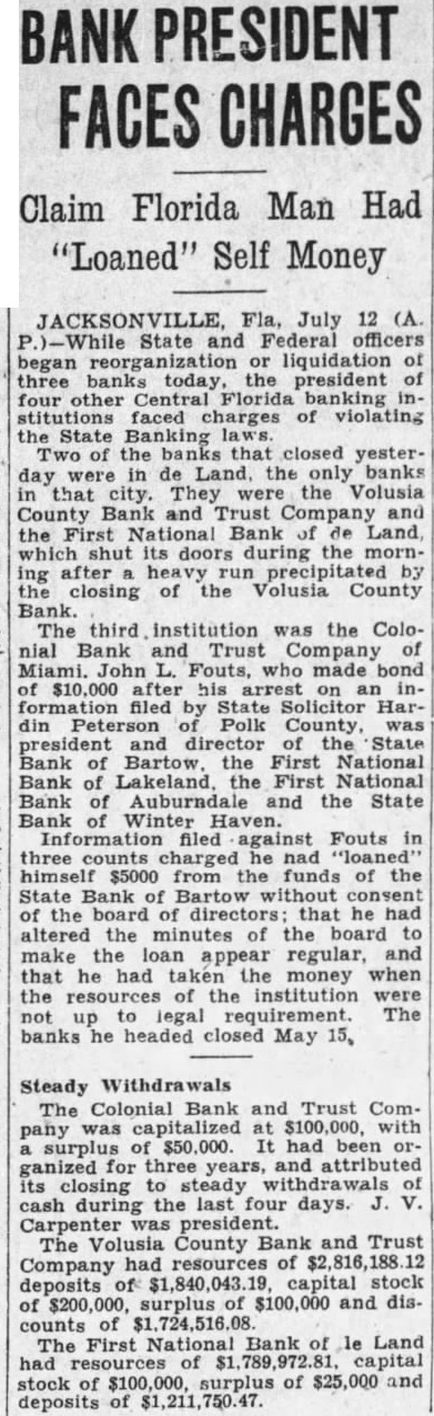 Headed Four Banks. The bank official, who made bond of $10,000 after his arrest on an information filed by State Solicitor Hardin Peterson. of Polk county, was John L. Fouts, president and director of the State Bank of Bartow, the First National Bank of Lakeland, the First National Bank of Auburndale, and the State Bank of Winter Haven. Information filed against Fouts in three counts charged that he had "loaned" himself $5,000 from the funds of the State Bank of Bartow without consent of the board of rectors, that he had altered the minutes of the board to make the loan appear regular, and that he had taken the money when resources of the institution were not to legal requirement. Time of arraignment for preliminary hearing is expected to be set in fe wdays. All four of the banks headed by Fouts closed on May 15. Technical charges against him name violation of state banking laws. Steady Withdrawals. The Colonial Bank and Trust company was capitalized at $100,000 with a surplus of $50,000. had been organized for three years, and attributed its closing to steady withdrawals of cash during the last four days. J. V. Carpenter was president. The Volusia County Bank and Trust company had resources of $2,818,888.12; deposits of $1,840,048.19; capital stock of $200,000; surplus of $100,000: and discounts The First National Bank of DeLand had resources of $1,789,971.81; capital stock of $100,000; surplus of $25,000, and deposits of D. B. Tuten, president of this institution, said in statement 'that a strong unexpected run had exhausted our cash supply and we had no time in which to secure additional funds We, therefore. were compelled to close our doors for the protection of depositors, believing it for the best interest of everyone." He added that the bank had been placed in the hands of federal authorities pending reorganization or liquidation. Dr. Lincoln Hulley, president of Stetson university, recently became president of the Volusia County bank. According to statement posted in the window of this institution, the bank was closed and placed in the hands of the state banking department "for protection of all depositors by order of the board of directors. Plans have been discussed and further action is contemplated looking to reorganiaztion of the bank with the purpose in view of paying the depositors in full."